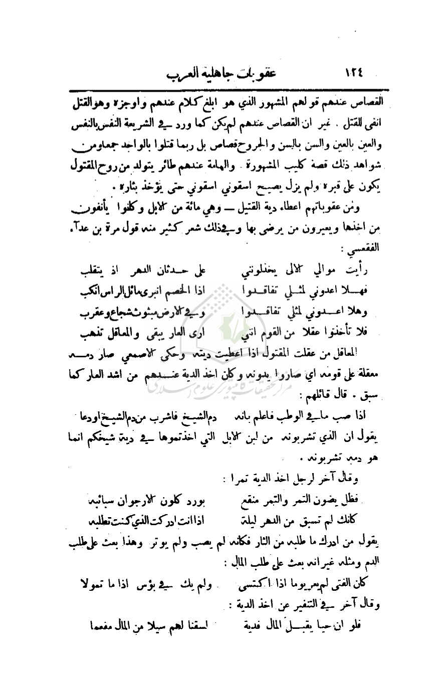 ومن عقوباتهم إعطاء دية القتيل - وهي مائة من الإبل وكانوا يأنفون من أخذها ويعيرون من يرضى بها وفي ذلك شعر كثير منه قول مرة بن عدآء الفقعسي: