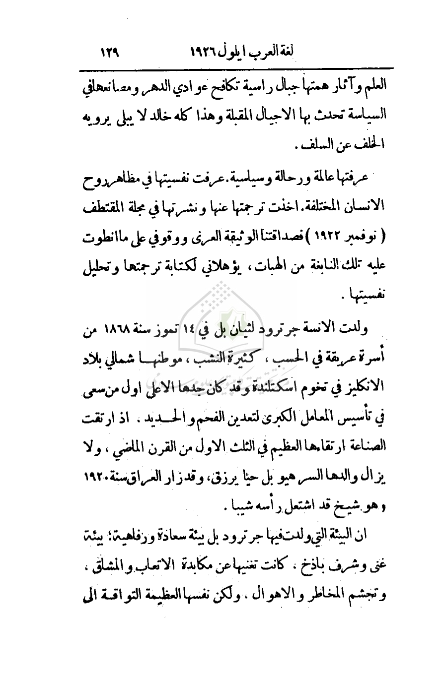 ولدت الآنسة جرترود لثيان بل في 14 تموز سنة 1868 من أسرة عريقة في الحسب، كثيرة النشب، موطنها شمالي بلاد الإنكليز في تخوم اسكتلندة وقد كان جدها الأعلى أول من سعى في تأسيس المعامل الكبرى لتعدين الفحم والحديد. إذ ارتقت الصناعة ارتقاءها العظيم في الثلث الأول من القرن الماضي، ولا يزال والدها السر هيو بل حيا يرزق، وقد زار العراق سنة 1920 وهو شيخ قد اشتعل رأسه شيبا.