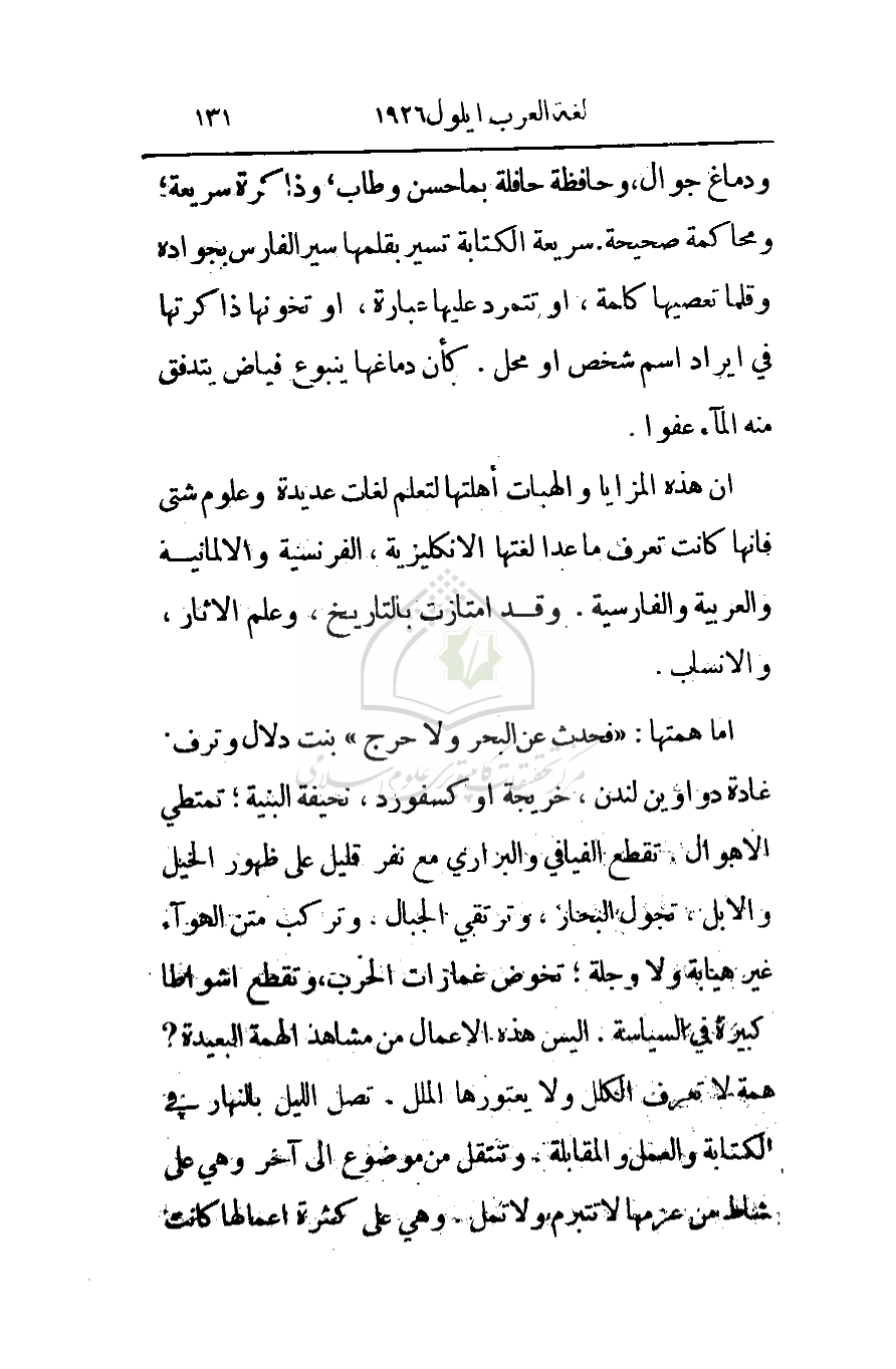 ودماغ جوال، وحافظة حافلة بما حسن وطاب، وذاكرة سريعة، ومحاكمة صحيحة. سريعة الكتابة تسير بقلمها سير الفارس بجواده وقلما تعصيها كلمة، أو تتمرد عليها عبارة، أو تخونها ذاكرتها في أيراد اسم شخص أو محل. كأن دماغها ينبوع فياض يتدفق منه الماء عفوا.