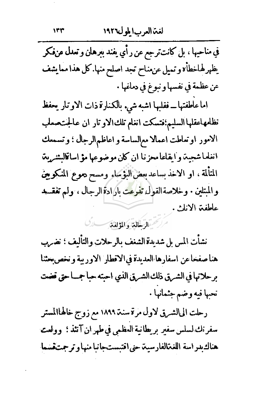 أما عاطفتها - فقلبها أشبه شيء بالكنارة ذات الأوتار يحفظ نظامها عقلها السليم؛ فتسكت أنغام تلك الأوتار أن عالجت صعاب الأمور أو تعاطت أعمالا مع الساسة وأعاظم الرجال؛ وتسمعك أنغاما شجية وإيقاعا محزنا أن كان موضوعها مؤاساة لبشرية المتألمة، أو الأخذ بساعد بعض البؤساء ومسح دموع المنكوبين والمبتلين. وخلاصة القول تذرعت بإرادة الرجال، ولم تفقد عاطفة الإناث.