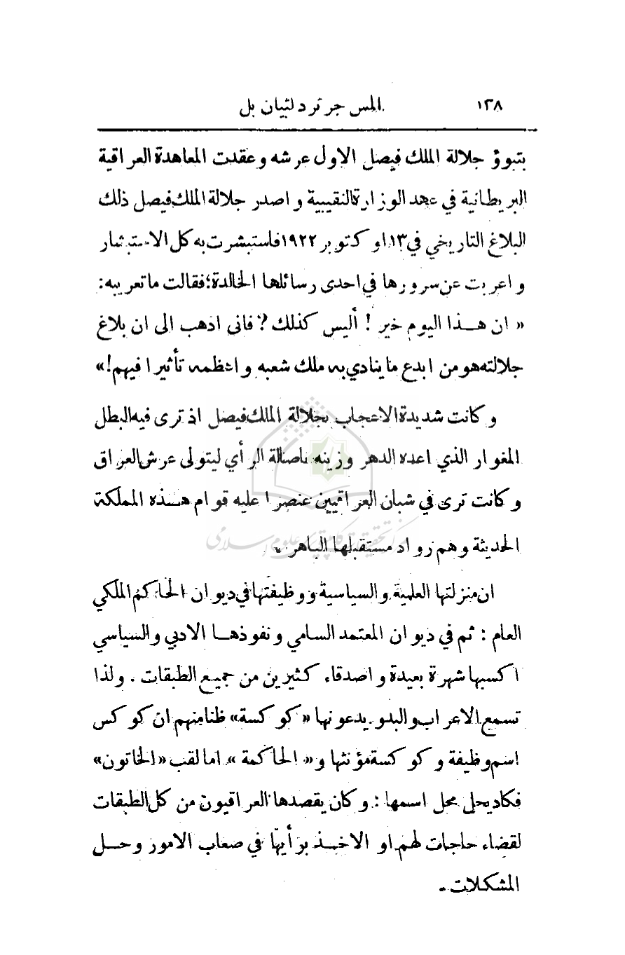 وكانت شديدة الإعجاب بجلالة الملك فيصل إذ ترى فيه البطل المغوار الذي أعده الدهر وزينه بأصالة الرأي ليتولى عرش العراق وكانت ترى في شبان العراقيين عنصرا عليه قوام هذه المملكة الحديثة وهم رواد مستقبلها الباهر.