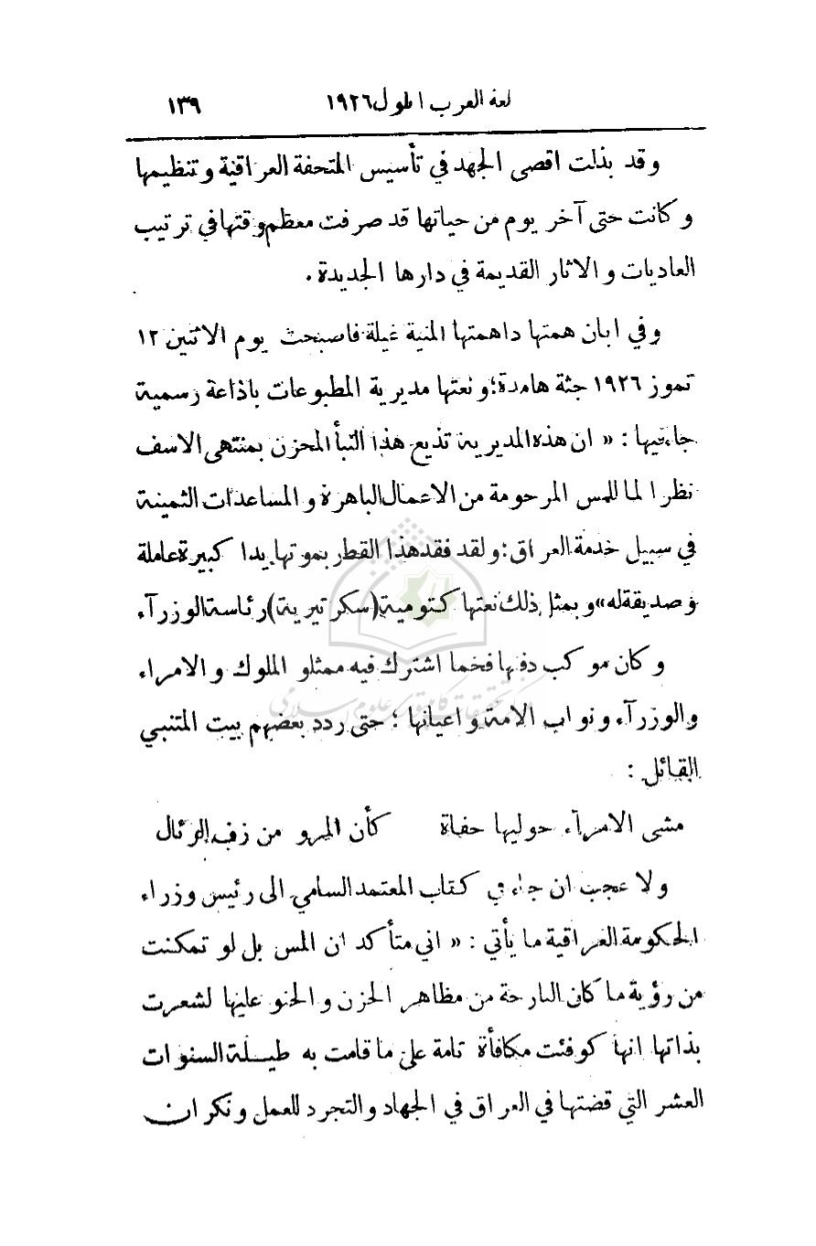 وقد بذلت أقصى الجهد في تأسيس المتحفة العراقية وتنظيمها وكانت حتى آخر يوم من حياتها قد صرفت معظم وقتها في ترتيب العاديات والآثار القديمة في دارها الجديدة.