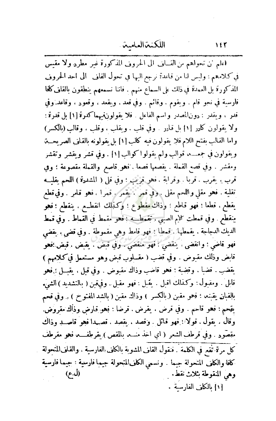 اعلم أن تحولهم من القاف إلى الحروف المذكورة غير مطرد ولا مقيس في كلامهم؛ وليس لنا من قاعدة نرجع إليها في تحول القاف إلى أحد الحروف المذكورة بل العمدة في ذلك على السماع منهم، فإننا نسمعهم ينطقون بالقاف كافا فارسية في نحو قام، ويقوم، وقائم، وفي قعد، ويقعد، وقعود، وقاعد، وفي قدر، ويقدر؛ دون المصدر واسم الفاعل، فلا يقولون فيهما كدرة بل قدرة؛ ولا يقولون كادر بل قادر، وفي قلب، ويقلب، وقلب، وقالب (بالكسر) وأما القالب بفتح اللام فلا يقولون فيه كالب بل يقولونه بالقاف الصريحة ويقولون في جمعه قوالب ولم يقولوا كوالب. وفي قشر ويقشر وتقشر ومقشر وفي قصع القملة، يقصعها