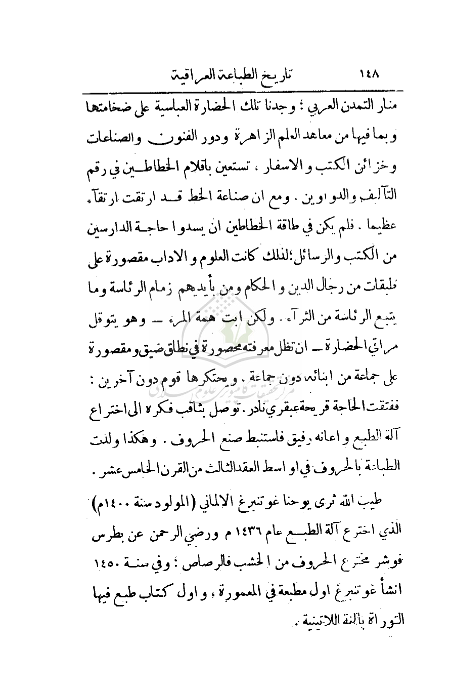 منار التمدن العربي؛ وجدنا تلك الحضارة العباسية على ضخامتها وبما فيها من معاهد العلم الزاهرة ودور الفنون والصناعات وخزائن الكتب والأسفار، تستعين بأقلام الخطاطين في رقم التآليف والدواوين. ومع أن صناعة الخط قد ارتقت ارتقاء عظيما. فلم يكن في طاقة الخطاطين أن يسدوا حاجة الدارسين من الكتب والرسائل؛ لذلك كانت العلوم والآداب مقصورة على طبقات من رجال الدين والحكام ومن بأيديهم زمام الرئاسة وما يتبع الرئاسة من الثراء. ولكن أبت همة المرء - وهو يتوقل مراقي الحضارة - أن تظل معرفته محصورة في نطاق ضيق ومقصورة على جماعة من أبنائه دون جماعة، ويحتكرها قوم دون آخرين: ففتقت الحاجة قريحة عبقري نادر. توصل بثاقب فكره إلى اختراع آلة الطبع وأعانه رفيق فاستنبط صنع الحروف. وهكذا ولدت الطباعة بالحروف في أواسط العقد الثالث من القرن الخامس عشر.