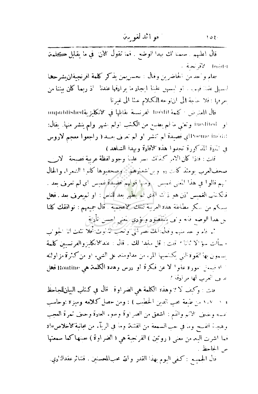 قلت: وكيف لا؟ وهذه الكلمة هي الضراوة. قال في كتاب البيان للجاحظ (107: 1 من طبعة محب الدين الخطيب): ومن حصل كلامه وميزه؛ وحاسب نفسه وخاف الإثم والذم؛ أشفق من الضراوة وسوء العادة وخاف ثمرة العجب وهجنة القبح وما في حب السمعة من الفتنة وما في الرياء من مجانبة الإخلاص) أهـ فما أشرت إليه من معنى (روتين) الفرنجية هي (الضراوة) بعينها كما سمعتها عن الجاحظ.