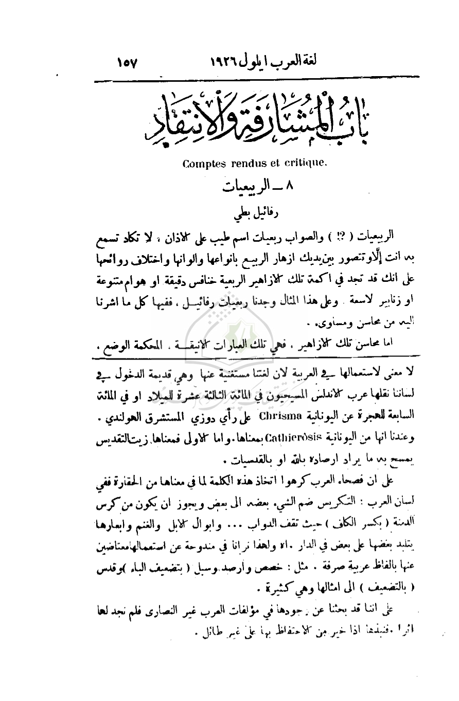 الربيعيات (؟!) والصواب ربعيات اسم طيب على الاذان، لا تكاد تسمع به أنت إلاَّ وتتصور بين يديك أزهار الربيع بأنواعها وألوانها واختلاف روائحها على انك قد تجد في أكمة تلك الازاهير الربعية خنافس دقيقة أو هوام متنوعة أو زنابير لاسعة. وعلى هذا المثال وجدنا ربعيات رفائيل، ففيها كل ما أشرنا إليه من محاسن ومساوئ.
