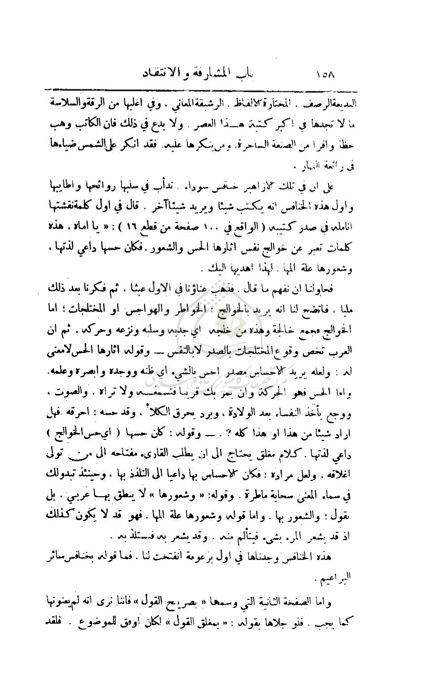 فحاولنا أن نفهم ما قال. فذهب عناؤنا في الأول عبثا. ثم فكرنا بعد ذلك مليا، فاتضح لنا أنه يريد بالخوالج؛ الخواطر والهواجس أو المختلجات؛ أما الخوالج فجمع خالجة وهذه من خلجه أي جذبه وسلبه ونزعه وحركه. ثم أن العرب تخص وقوع المختلجات بالصدر لا بالنفس - وقوله أثارها الحس لا معنى له: ولعله يريد الإحساس مصدر أحس بالشيء أي ظنه ووجده وأبصره وعلمه. وإما الحس فهو الحركة وأن يمر بك قريبا فتسمعه ولا تراه، والصوت، ووجع يأخذ النفساء بعد الولادة. وبرد يحرق الكلأ، وقد حسه: احرقه فهل أراد شيئا من هذا أو هذا كله؟. - وقوله: كان حسها (أي حس الخوالج) داعي لذتها. كلام مغلق يحتاج إلى أن يطلب القارئ مفتاحه إلى من تولى إغلاقه، ولعل مراده: فكان الإحساس بها داعيا إلى التلذذ بها، وحينئذ تبدو لك في سماء المعنى سحابة ماطرة. وقوله: (وشعورها) لا