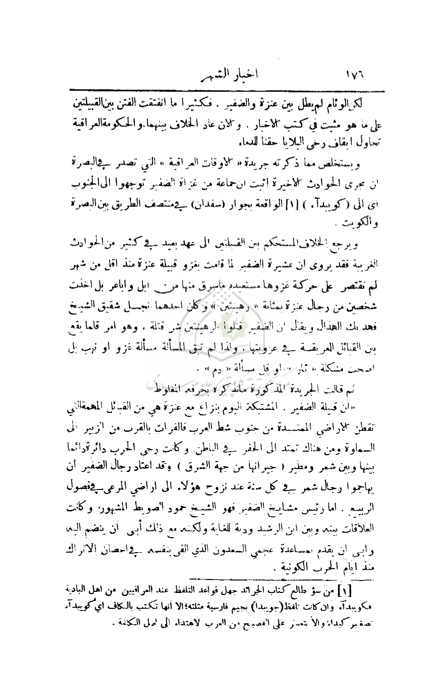 ويستخلص مما ذكرته جريدة (الأوقات العراقية) التي تصدر في البصرة أن مجرى الحوادث الأخيرة اثبت أن جماعة من غزاة الضفير توجهوا إلى الجنوب أي إلى (كويبدآء) الواقعة بجوار (سفدان) في منتصف الطريق بين البصرة والكويت.