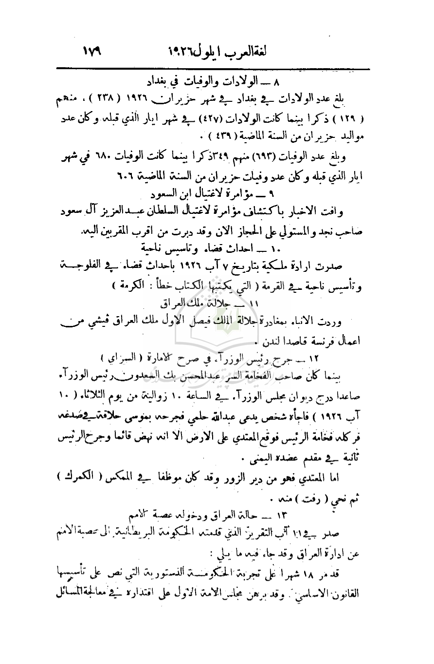 بلغ عدد الولادات في بغداد في شهر حزيران 1926 (238)، منهم (129) ذكرا بينما كانت الولادات (427) في شهر أيار الذي قبله وكان عدد مواليد حزيران من السنة الماضية (439).