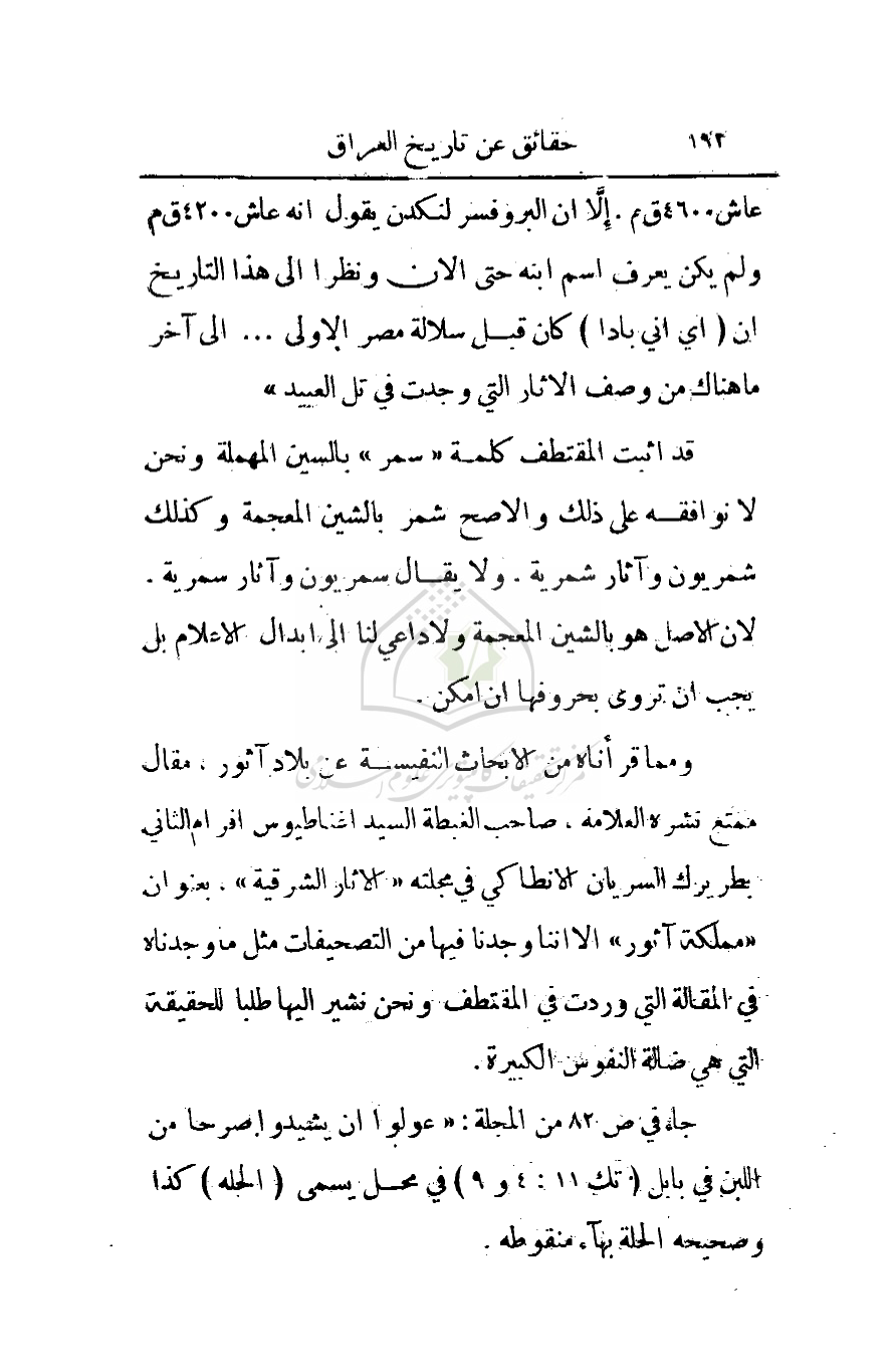 قد اثبت المقتطف كلمة (سمر) بالسين المهملة ونحن لا نوافقه على ذلك والأصح شمر بالشين المعجمة وكذلك شمريون وآثار شمرية. ولا يقال سمريون وآثار سمرية. لأن الأصل هو بالشين المعجمة ولا داعي لنا إلى إبدال الأعلام بل يجب أن تروى بحروفها أن أمكن.