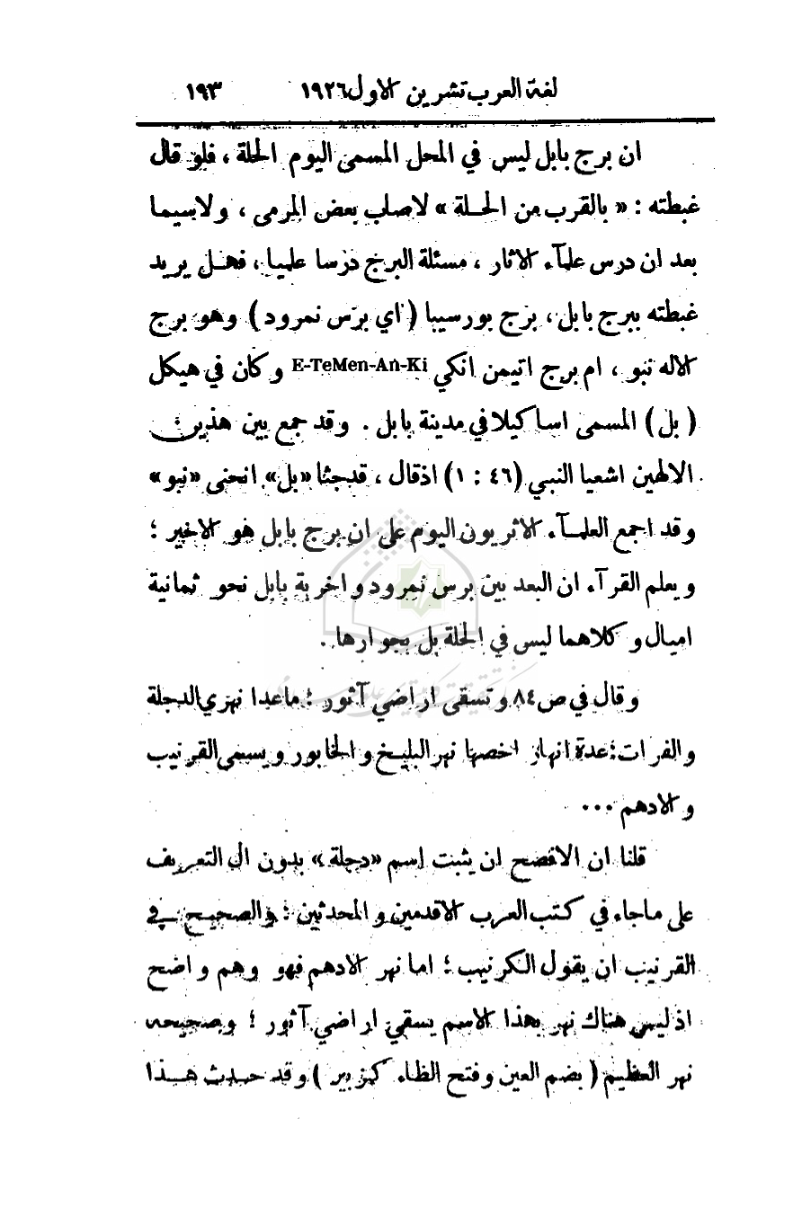 أن برج بابل ليس في المحل المسمى اليوم الحلة، فلو قال غبطته: (بالقرب من الحلة) لأصاب بعض المرمى، ولا سيما بعد أن درس علماء الاثار، مسئلة البرج درسا علميا، فهل يريد غبطته ببرج بابل، برج بورسيبا (أي برس نمرود) وهو برج الإله نبو، أم برج أتيمن انكي - وكان في هيكل (بل) المسمى اساكيلا في مدينة بابل. وقد جمع بين هذين الإلهين اشعيا النبي (1: 46) إذ قال، قدجثا (بل) انحنى (نبو) وقد اجمع العلماء الأثريون اليوم على أن برج بابل هو الأخير؛ ويعلم القراء أن البعد بين برس نمرود واخربة بابل نحو ثمانية أميال وكلاهما ليس في الحلة بل بجوارها.