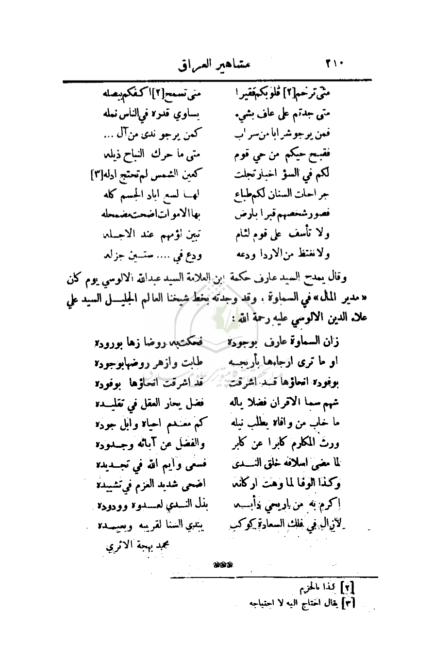 وقال يمدح السيد عارف حكمة ابن العلامة السيد عبد الله الالوسي يوم كان (مدير المال) في السماوة، وقد وجدته بخط شيخنا العالم الجليل السيد علي علاء الدين الالوسي عليه رحمة الله: