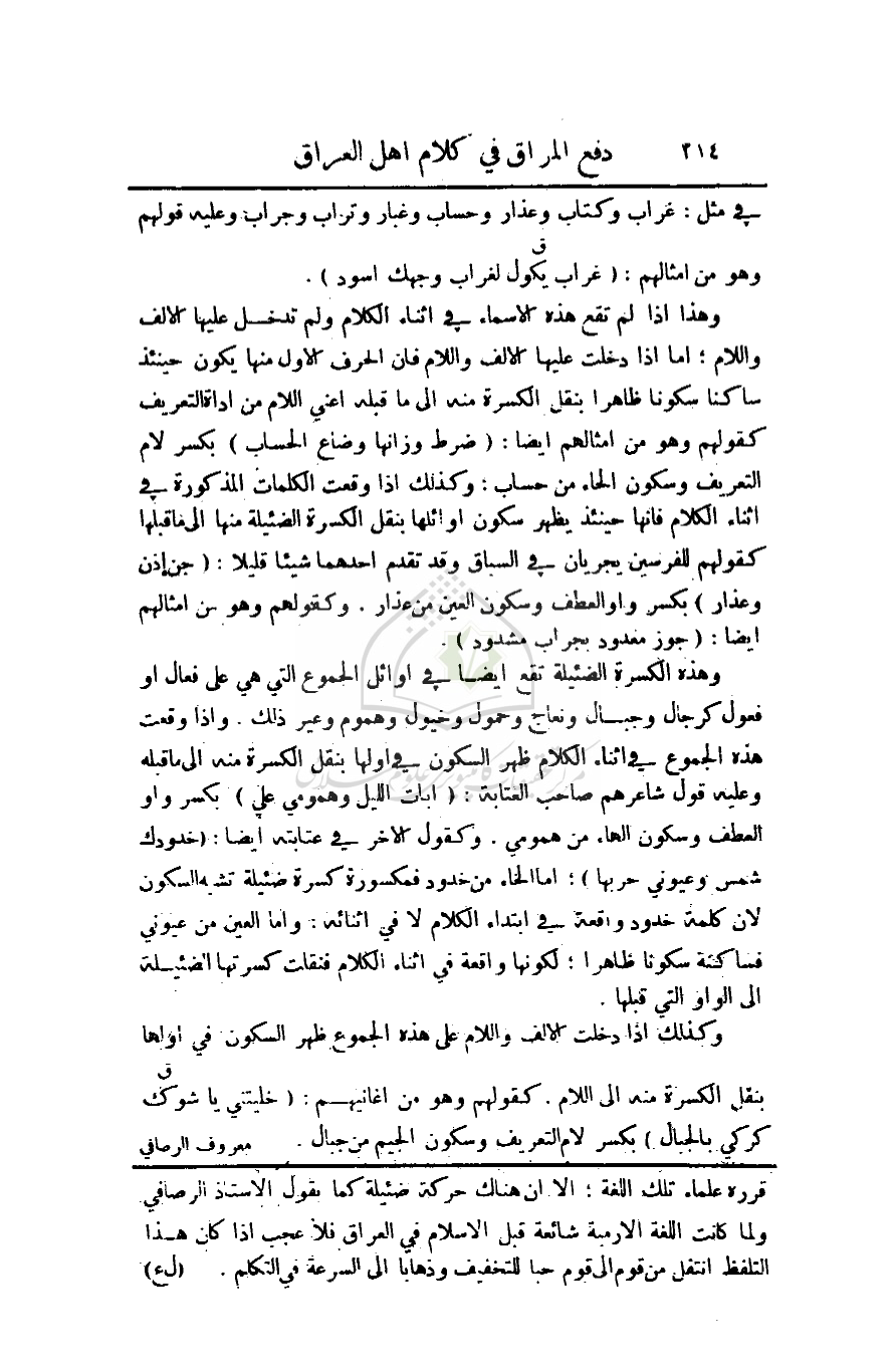 وهذا إذا لم تقع هذه الأسماء في أثناء الكلام ولم تدخل عليها الألف واللام؛ أما إذا دخلت عليها الألف واللام فان الحرف الأول منها يكون حينئذ ساكنا سكونا ظاهرا بنقل الكسرة منه إلى ما قبله اعني اللام من أداة التعريف كقولهم وهو من أمثالهم أيضا: (ضرط وزانها وضاع الحساب) بكسر لام التعريف وسكون الحاء من حساب؛ وكذلك إذا وقعت الكلمات المذكورة في أثناء الكلام فإنها حينئذ يظهر سكون أوائلها بنقل الكسرة الضئيلة منها إلى ما قبلها كقولهم للفرسين يجريان في السباق وقد تقدم أحدهما شيئا قليلاً؛ (جن إذن وعذار) بكسر واو العطف وسكون العين من عذار. وكقولهم وهو من أمثالهم أيضا: (جوز معدود بجراب مشدود).
