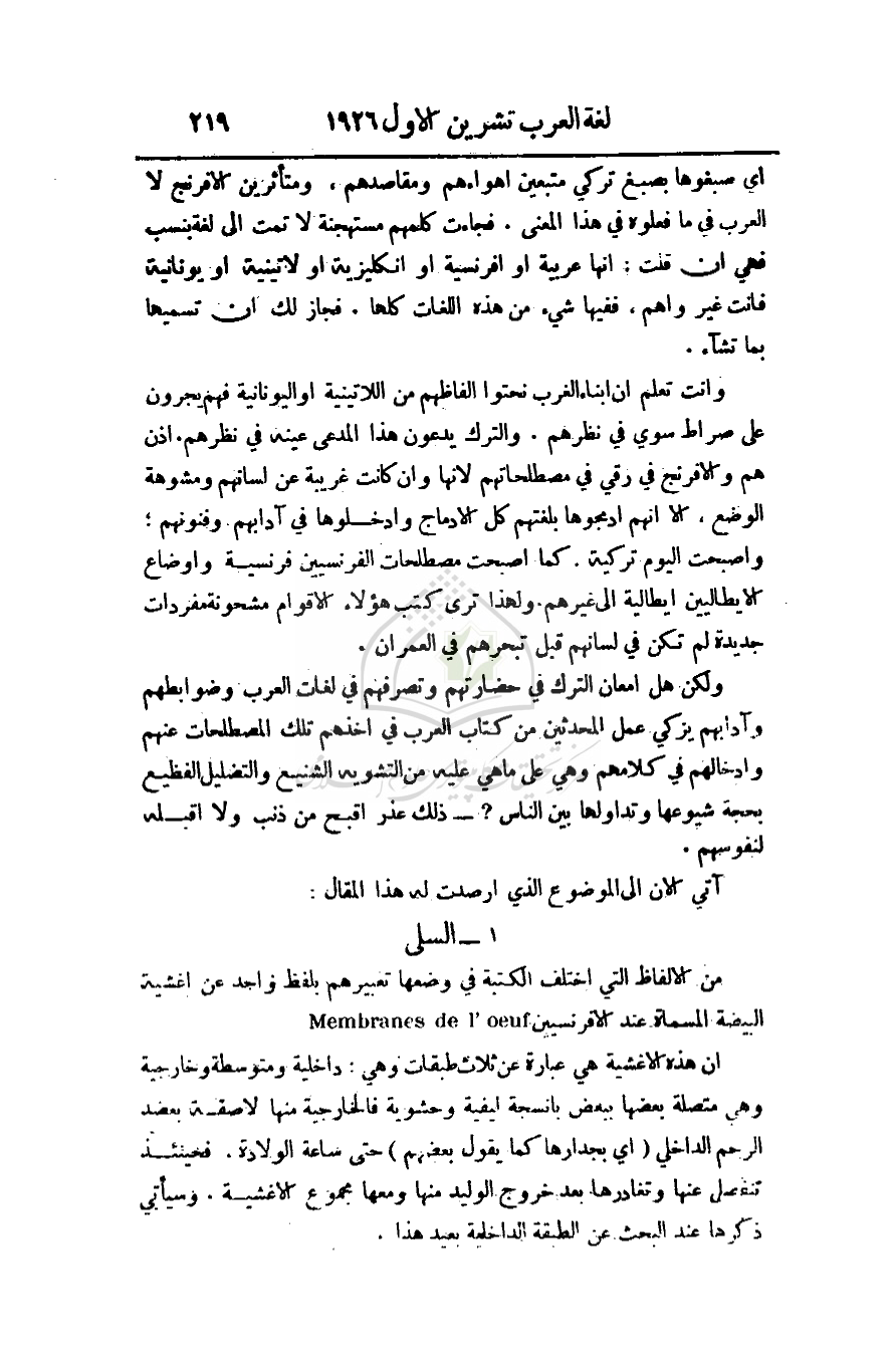 وأنت تعلم أن أبناء الغرب نحتوا ألفاظهم من اللاتينية أو اليونانية فهم يجرون على صراط سوي في نظرهم. والترك يدعون هذا المدعى عينه في نظرهم. إذن هم والإفرنج في رقي في مصطلحاتهم لأنها وإن كانت غريبة عن لسانهم ومشوهة الوضع. إلاَّ انهم ادمجوها بلغتهم كل الإدماج وادخلوها في آدابهم وفنونهم؛ وأصبحت اليوم تركية، كما أصبحت مصطلحات الفرنسيين فرنسية وأوضاع الإيطاليين إيطالية إلى غيرهم. ولهذا ترى كتب هؤلاء الأقوام مشحونة مفردات جديدة لم تكن في لسانهم قبل تبحرهم في العمران.