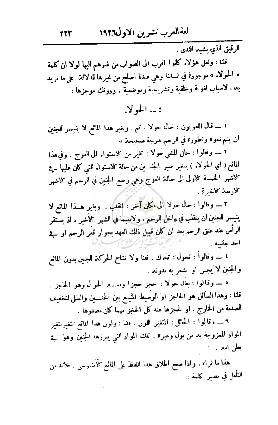 5 - وقالوا: حال حولا: حجز حجزا ومنه الحول وهو الحاجز. قلنا: وهذا السائل هو الحاجز أو الوسيط المنيع بين الجنين والسلى لتخفيف الصدمة من الخارج، أو لحجزها عنه كل الحجز مهما كان مصدرها.