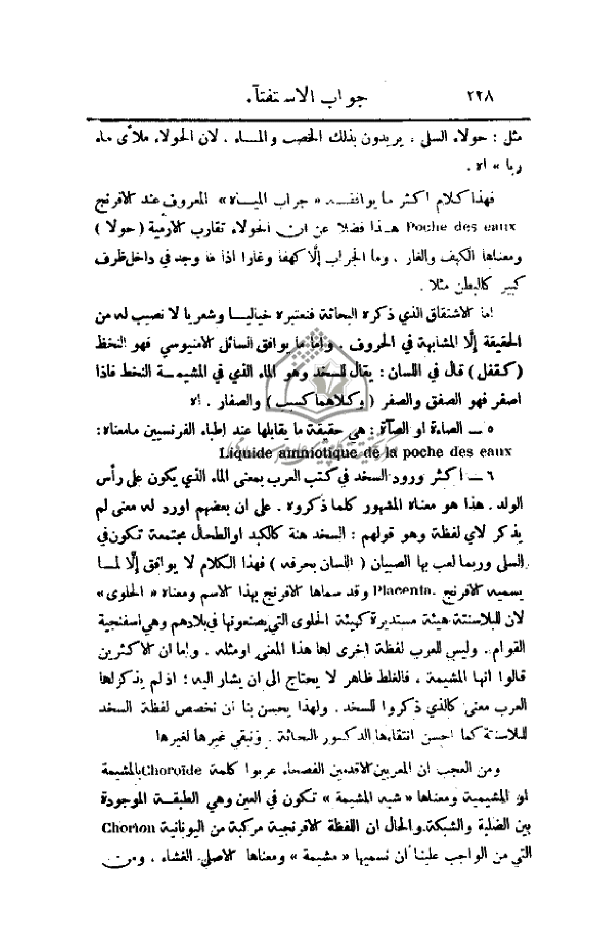 ومن العجب أن المعربين الأقدمين الفصحاء عربوا كلمة بالمشيمة أو المشيمية ومعناها (شبه المشيمة) تكون في العين وهي الطبقة الموجودة بين الصلبة والشبكة. والحال أن اللفظة الإفرنجية مركبة من اليونانية التي من الواجب علينا أن نسميها (مشيمة) ومعناها الأصلي الغشاء. ومن