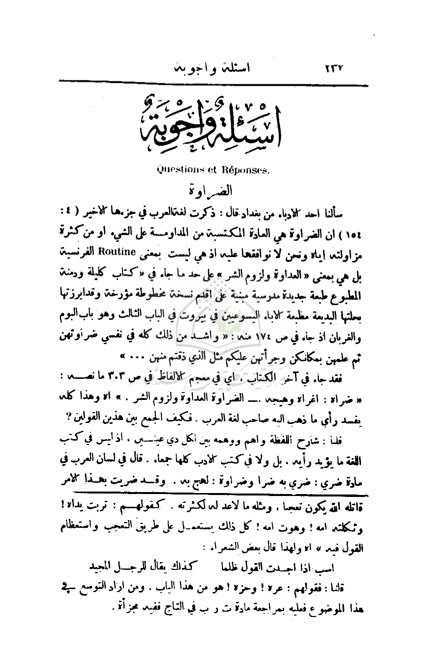سألنا أحد الأدباء من بغداد قال: ذكرت لغة العرب في جزءها الأخير (154: 4) أن الضراوة هي العادة المكتسبة من المداومة على الشيء أو من كثرة مزاولته إياه ونحن لا نوافقها عليه إذ هي ليست بمعنى الفرنسية بل هي بمعنى (العدوة ولزوم الشر) على حد ما جاء في (كتاب كليلة ودمنة المطبوع طبعة جديدة مدرسية مبنية على قدم نسخة مخطوطة مؤرخة وقد أبرزتها بحلتها البديعة مطبعة الأباء اليسوعيين في بيروت في الباب الثالث وهو باب البوم والغربان إذ جاء في ص174 منه: (واشد من ذلك كله في نفسي ضراوتهن ثم علمهن بمكانكن وجرأتهن عليكم مثل الذي ذقتم منهن. . .)