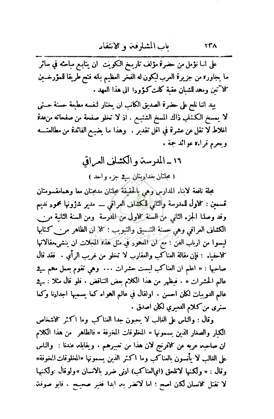 مجلة نافعة لأبناء المدارس وهي بالحقيقة مجلتان مدمجتان معا وهما مقسومتان قسمين: الاول للمدرسة والثاني للكشاف العراقي - مدير شؤونها محمود نديم وقد وصلنا الجزء الثاني من السنة الأولى من المدرسة ومن السنة الثانية من الكشاف العراقي وهي حسنة التنسيق والتبويب؛ إلا أن الظاهر من كتابها ليسوا من أرباب الفن؛ مع أن المعهود في مثل هذه المجلات أن ينشئ مقالاتها الاحفياء؛ فإن مقالة العناكب والعقارب لا تخلو من غريب الرأي. فقد قال صاحبها: (أعلم أن العناكب ليست حشرات. . . وهي تقوم بعمل مهم في عالم الحشرات). فيظهر من هذا الكلام بعض التناقض. فلو قال مثلا: في عالم الدويبات لكان أحسن. أو لقال في عالم الهوام كما يسميها أجدادنا وكما سترى من كلام الدميري لكان اصدق.