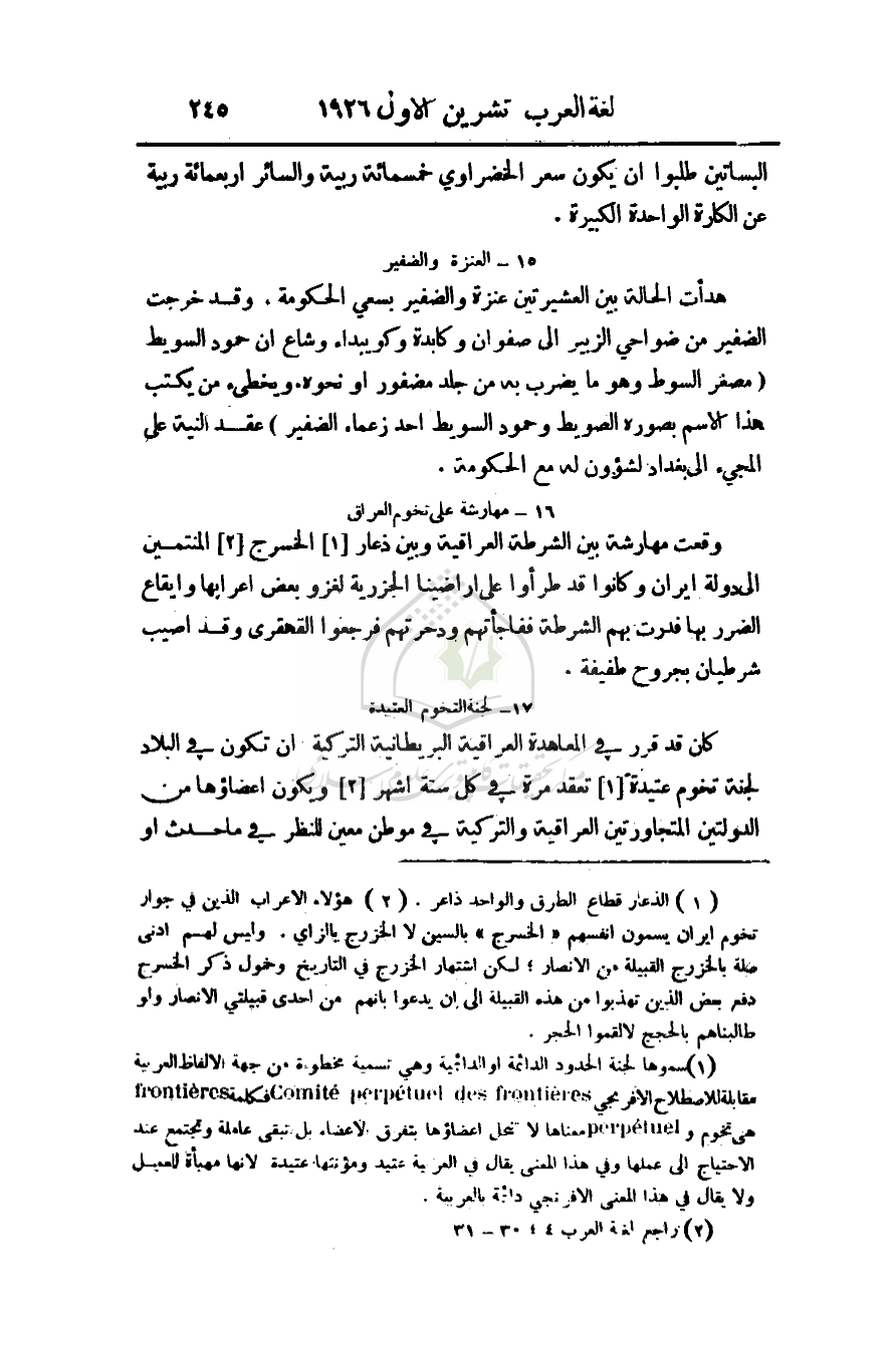 كان قد قرر في المعاهدة العراقية البريطانية التركية أن تكون في البلاد لجنة تخوم عتيدة تعقد مرة في كل ستة أشهر ويكون أعضاؤها من الدولتين المتجاورتين العراقية والتركية في موطن معين للنظر في ما حدث أو