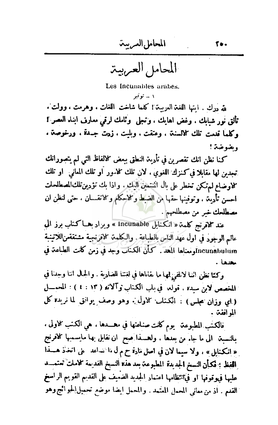 لله درك، أيتها اللغة العربية! كلما شاخت اللغات، وهرمت، وولت، تألق نور شبابك، وغض اهابك، وتجلى وئامك لرقي معارف أبناء العصر! وكلما قدمت تلك الألسنة، وعتقت، وبليت، زدت جدة، ورخوصة، وبضوضة!