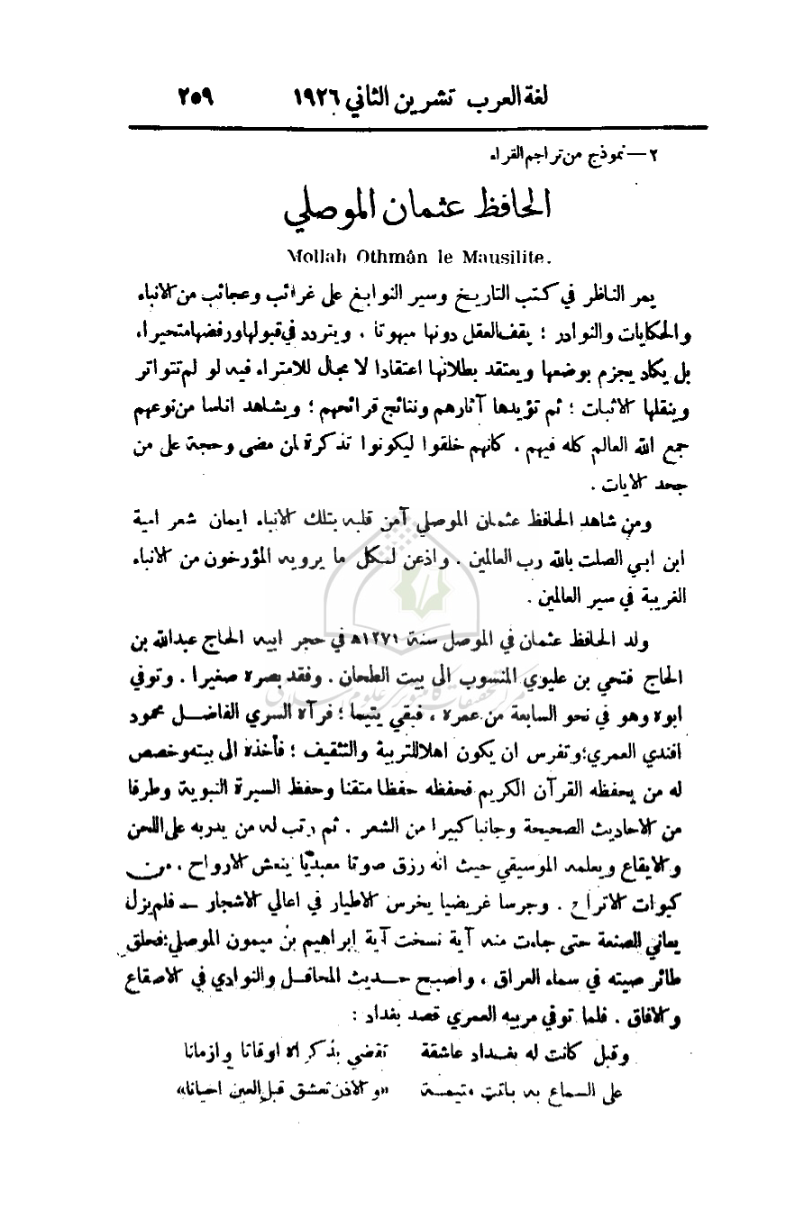 ومن شاهد الحافظ عثمان الموصلي آمن قلبه بتلك الأنباء إيمان شعر أمية ابن أبي الصلت بالله رب العالمين. وأذعن لكل ما يرويه المؤرخون من الأنباء الغريبة في سير العالمين.