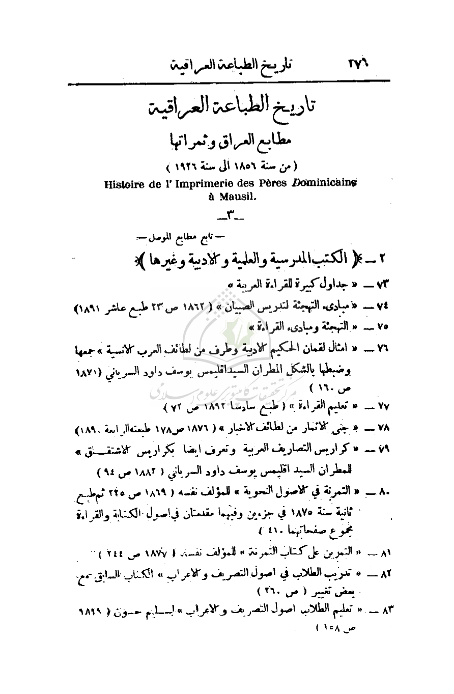 80 - (التمرنة في الاصول النحوية) للمؤلف نفسه (1869 ص225 ثم طبع ثانية سنة 1875 في جزءين وفيهما مقدمتان في أصول الكتابة والقراءة مجموع صفحاتهما 410)