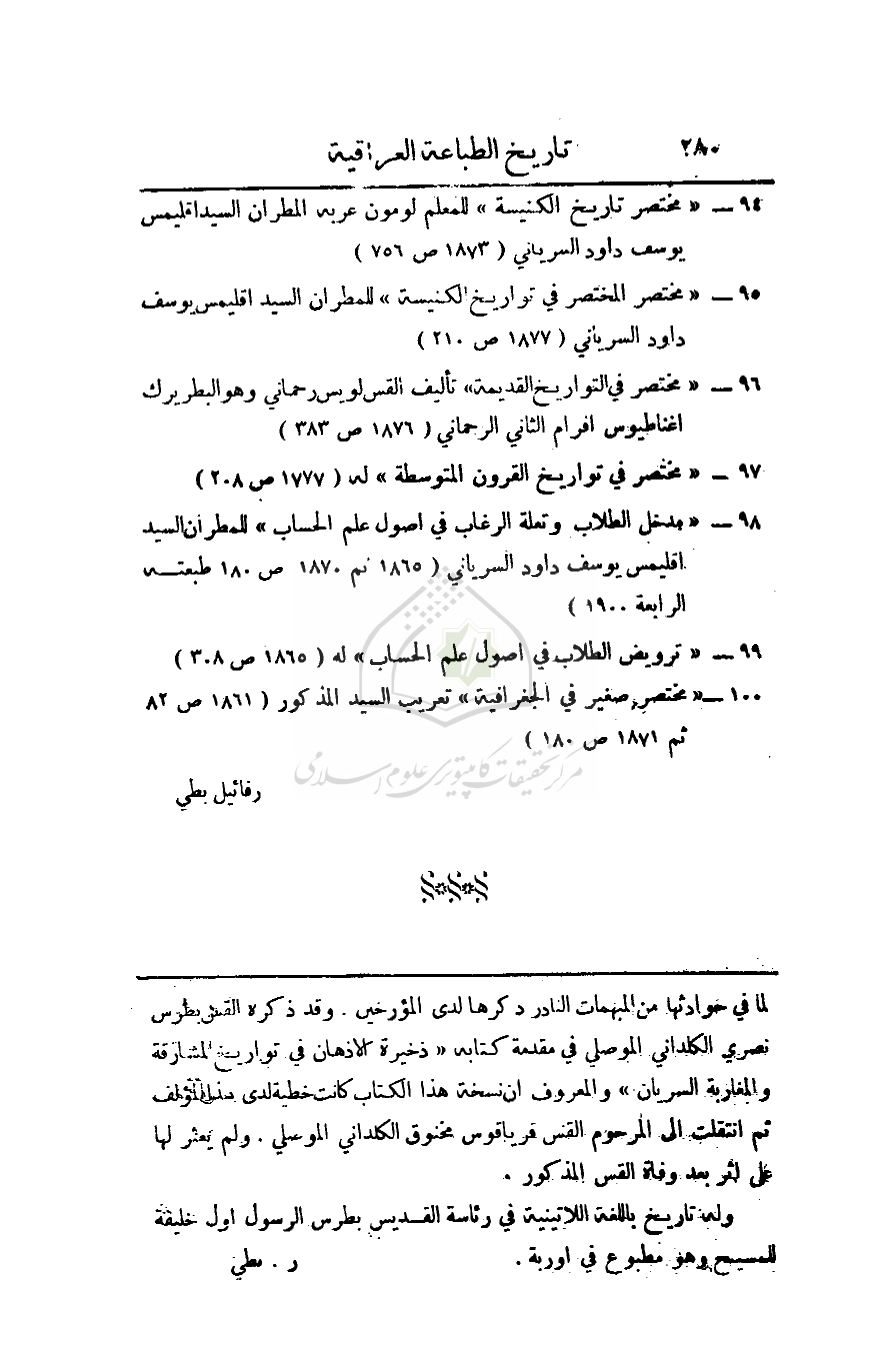 96 - (مختصر في التواريخ القديمة) تأليف القس لويس رحماني وهو البطريرك اغناطيوس افرام الثاني الرحماني (1876 ص383)