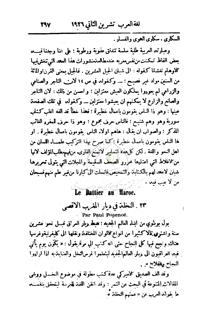وعبارته العربية طلية سلسة تتدفق عذوبة ورطوبة؛ على أننا وجدنا فيه بعض ألفاظ تمكنت من نفس معربه عند مطالعة منشورات هذا العهد التي تنغش فيها الأوهام نغشانا كقوله: إلى شبان الجيل العشرين. فالجيل بمعنى القرن أو المائة من السنين مولد غير فصيح؛ - وكقوله في ص14 لأن التاجر والصناعي والزراعي لم يعودوا يملكون العيش معتزلين؛ واحسن من ذلك: لأن التاجر والصانع والزارع لا يمكنهم أن يعيشوا معتزلين - وكقوله في تلك الصفحة عينها: وهو ذا الناس يقومون بأعمال خطيرة؛ فهذا خطأ قد ألفه اغلب كتاب سورية وهو وهم شنيع؛ فالناس حرف مجموع؛ وهو ذا حرف للمفرد الغائب المذكر؛ والصواب أن يقال: هاهم أولاء الناس يقومون بأعمال خطيرة. أو ها الناس يقومون بأعمال خطيرة؛ كما صرح بهذا التركيب علماء اللسان من أهل النحو واللغة. لكن كل هذه التعابير لا تمنع القارئ من فهم مطلب المؤلف لأنها من الأغلاط التي اعتادها محررو الصحف السقيمة والمجلات التي يتولى تحريرها شبان لا عهد لهم بالكتابة والتمحيص. فانسلت إلى كبارنا من غير علم منهم فسبحان من لا عيب فيه.