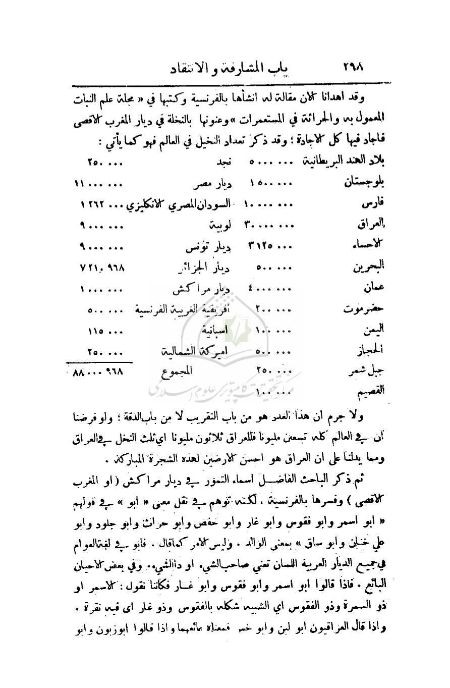 وقد أهدانا الآن مقالة له أنشأها بالفرنسية وكتبها في (مجلة علم النبات المعمول به والحراثة في المستعمرات) وعنونها بالنخلة في ديار المغرب الأقصى فأجاد فيها كل الإجادة: وقد ذكر تعداد النخيل في العالم فهو كما يأتي: