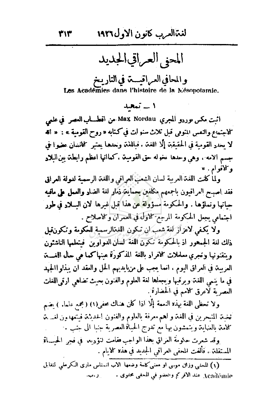 اثبت مكس نوردو المجري من أقطاب العصر في علمي الاجتماع والنفس المتوفى قبل ثلاث سنوات في كتابه (روح القومية): (إنه لا يحدد القومية في الحقيقة إلاَّ اللغة، فباللغة وحدها يعتبر الإنسان عضوا في جسم الأمة، وهي وحدها تخوله حق القومية، كما أنها أعظم رابطة بين البلاد والأقوام.)