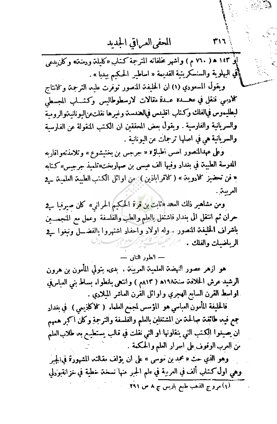 يقول المسعودي أن الخليفة المنصور توفرت عليه الترجمة والإنتاج الأدبي فنقل في عهده عدة مقالات لارسطوطاليس وكتاب المجسطي لبطليموس في الفلك وكتاب اقليدس في الهندسة وغيرها نقلت عن اليونانية والرومية والسريانية والفارسية. ويقول بعض المحققين أن الكتب المنقولة عن الفارسية والسريانية هي في اصلها ترجمات عن اليونانية.