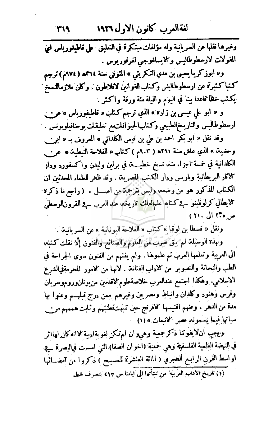 ونقل (قسطا بن لوقا) كتاب (الفلاحة اليونانية) عن السريانية.