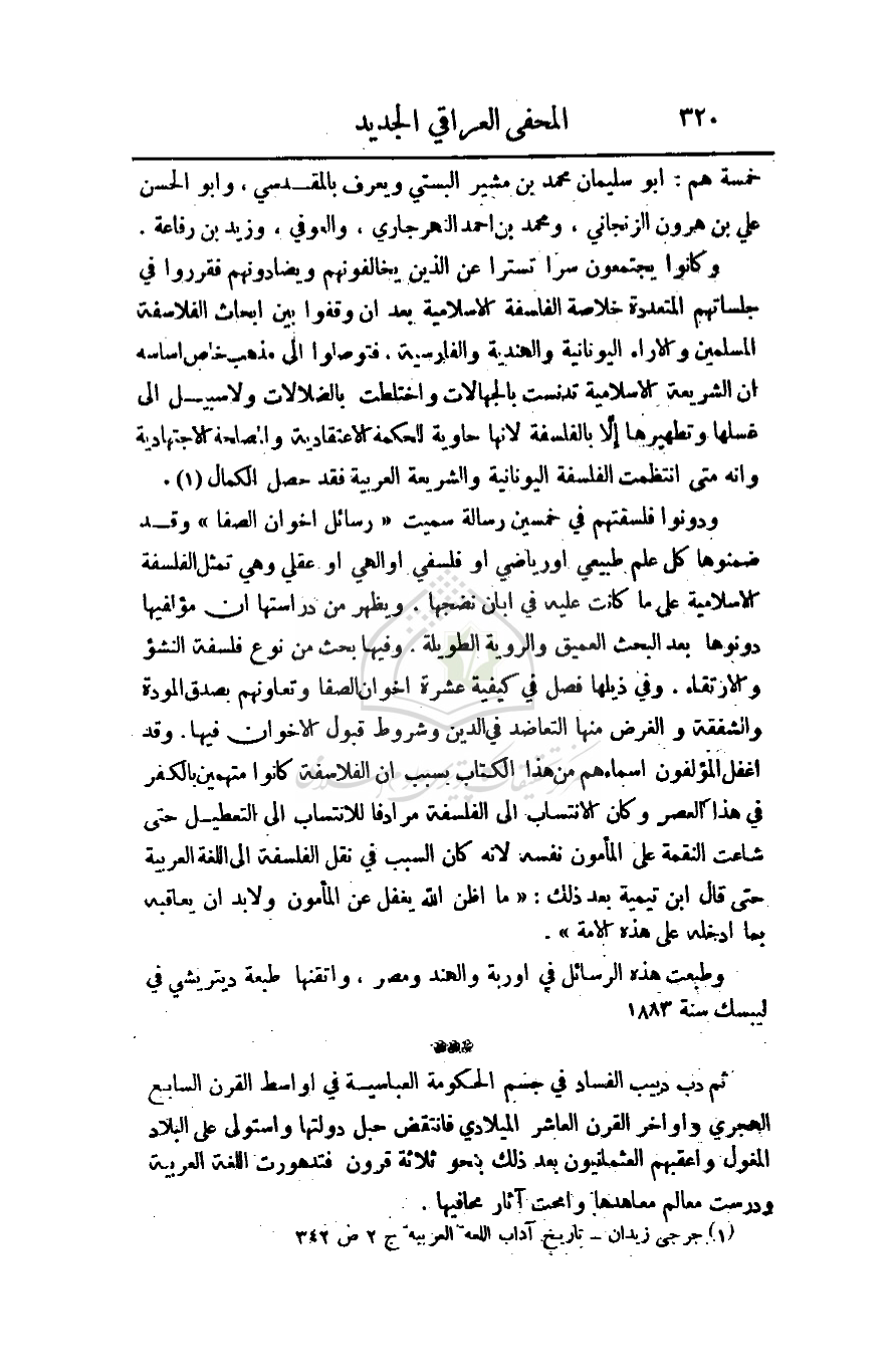 وكانوا يجتمعون سرا تسترا عن الذين يخالفونهم ويضادونهم فقرروا في جلساتهم المتعددة خلاصة الفلسفة الإسلامية بعد أن وقفوا بين أبحاث الفلاسفة المسلمين والآراء اليونانية والهندية والفارسية، فتوصلوا إلى مذهب خاص أساسه أن الشريعة الإسلامية تدنست بالجهالات واختلطت بالضلالات ولا سبيل إلى غسلها وتطهيرها إلاَّ بالفلسفة لأنها حاوية للحكمة الاعتقادية والمصلحة الاجتهادية وانه متى انتظمت الفلسفة اليونانية والشريعة العربية فقد حصل الكمال.