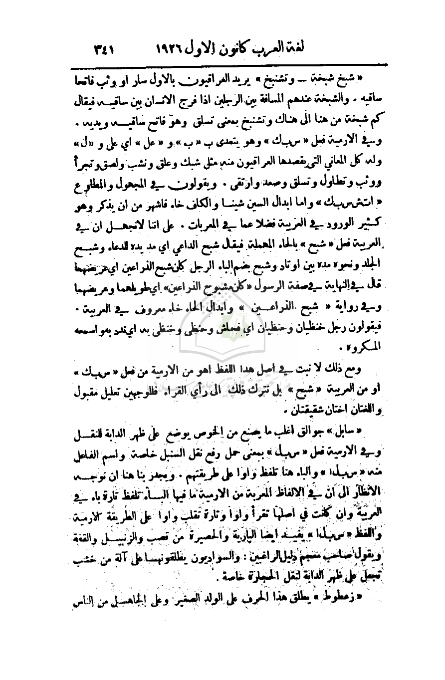 (شبخ شبخة - وتشنبخ) يريد العراقيون بالأول سار أو وثب فاتحا ساقيه. والشبخة عندهم المسافة بين الرجلين إذا فرج الإنسان بين ساقيه فيقال كم شبخة من هنا إلى هناك وتشنبخ بمعنى تسلق وهو فاتح ساقيه ويديه. وفي الارمية فعل (س ب ك) وهو يتعدى ب (ب) و (عل) أي على و (ل) وله كل المعاني التي يقصدها العراقيون منه مثل شبك وعلق ونشب ولصق وتجرأ ووثب وتطاول وتسلق وصعد وارتقى. ويقولون في المجهول والمطاوع (ات ش س ب ك) وأما إبدال السين شينا والكاف خاء فأشهر من أن يذكر وهو كثير الورود في العربية فضلا عما في المعربات. على أننا لا نجهل أن في العربية فعل (شبح) بالحاء المهملة فيقال شبح الداعي أي مد يده للدعاء وشبح الجلد ونحوه مده بين ارتاد وشبح بضم الباء الرجل كان شبح الذراعين أي عريضهما قال في النهاية في صفة الرسول (كان