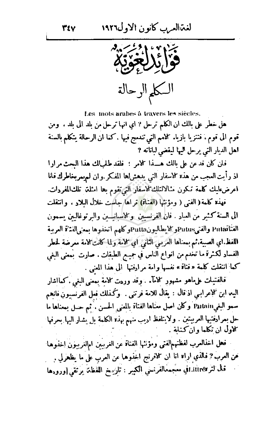 هل خطر على بالك أن الكلم ترحل؟ أي أنها ترحل من بلد إلى بلد. ومن قوم إلى قوم، فتتزيا بأزياء الأمم التي تندمج فيها، كما أن الرحالة يتكلم بألسنة أهل الديار التي يرحل إليها ليقضي لباناته؟