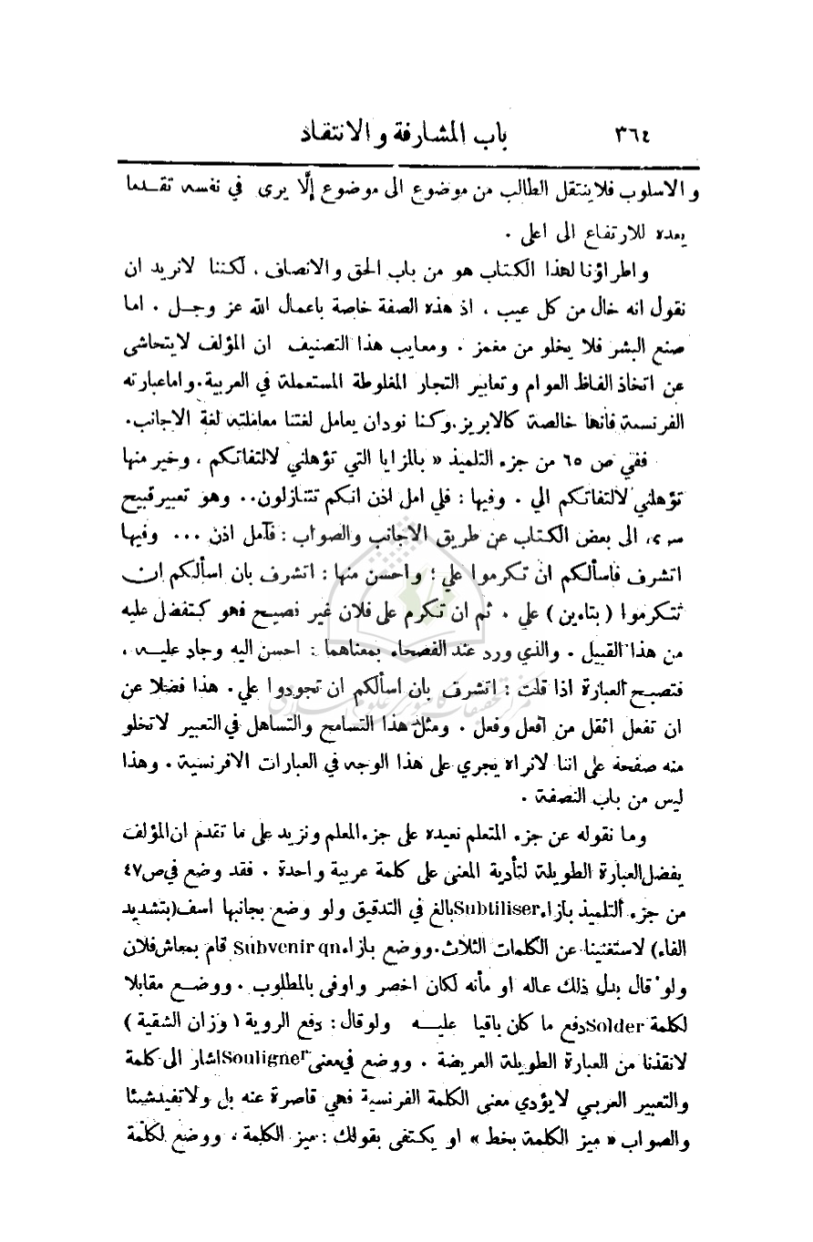 وإطراؤنا لهذا الكتاب هو من باب الحق والإنصاف. لكننا لا نريد أن نقول أنه خال من كل عيب، إذ هذه الصفة خاصة بأعمال الله عز وجل. أما صنع البشر فلا يخلو من مغمز. ومعايب هذا التصنيف أن المؤلف لا يتحاشى عن اتخاذ ألفاظ العوام وتعابير التجار المغلوطة المستعملة في العربية. وأما عبارته الفرنسية فإنها خالصة كالأبريز. وكنا نود أن يعامل لغتنا معاملته لغة الأجانب.