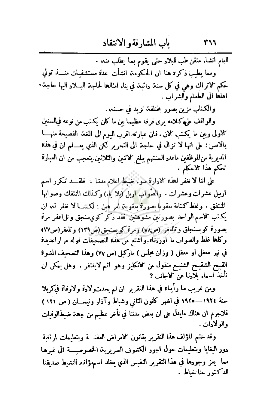 ومن غريب ما رأينا في هذا التقرير أن لم يحدث ولادة ولا وفاة في كربلا سنة 1924 - 1925 في أشهر كانون الثاني وشباط وآذار ونيسان (ص121) فلا جرم أن هناك ما يدل على أن بعض مدننا في تأخر عظيم من جهة ضبط الوفيات والولادات.