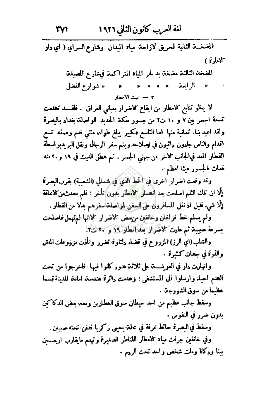 لا يخلو تتابع الأمطار من إيقاع الأضرار بمباني العراق. فلقد تهدمت تسعة أجسر بين 7 و10 ت2 من جسور سكة الحديد الواصلة بغداد بالبصرة ولقد أعيد بناء ثمانية منها أما التاسع فكبير يبلغ طوله مئتي قدم وعمقه تسع أقدام والناس جادون دائبون في إصلاحه. ويتم سفر الرجال ونقل البريد بواسطة القطار المعد في الجانب الآخر من جهتي الجسر، ثم هطل الغيث في 19 و20 منه فعاث بالجسور عيثا أعظم.