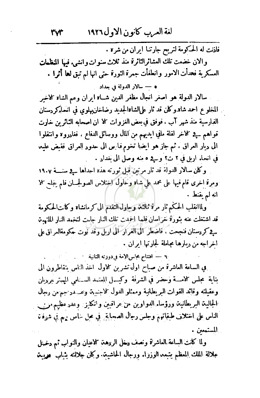 ولما كانت الساعة العاشرة ونصف دخل الردهة الأعيان والنواب ثم دخل جلالة الملك المعظم يتبعه الوزراء ورجال الحاشية. وكان جلالته بثياب عربية