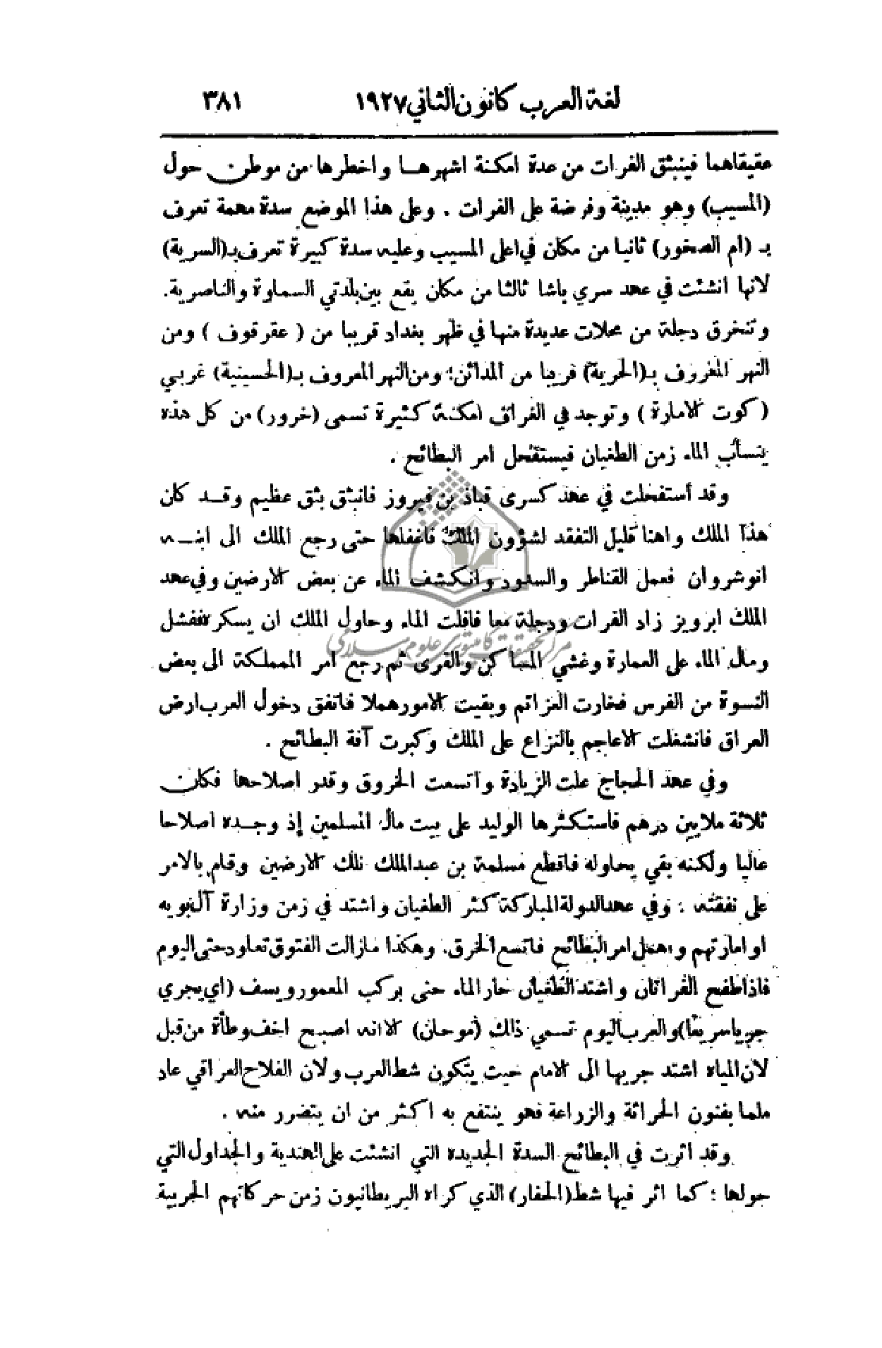 وقد استفحلت في عهد كسرى قباد بن فيروز فأنبثق بثق عظيم وقد كان هذا الملك واهنا قليل التفقد لشؤون الملك فأغفلها حتى رجع الملك إلى ابنه انوشروان فعمل القناطر والسدود وانكشف الماء عن بعض الأرضين وفي عهد الملك ابرويز زاد الفرات ودجلة معا فأفلت الماء وحاول الملك أن يسكره ففشل ومال الماء على العمارة وغشي المساكن والقرى ثم رجع أمر المملكة إلى بعض النسوة من الفرس فخارت العزائم وبقيت الأمور هملا فأتفق دخول العرب أرض العراق فانشغلت الأعاجم بالنزاع على الملك وكبرت آفة البطائح.
