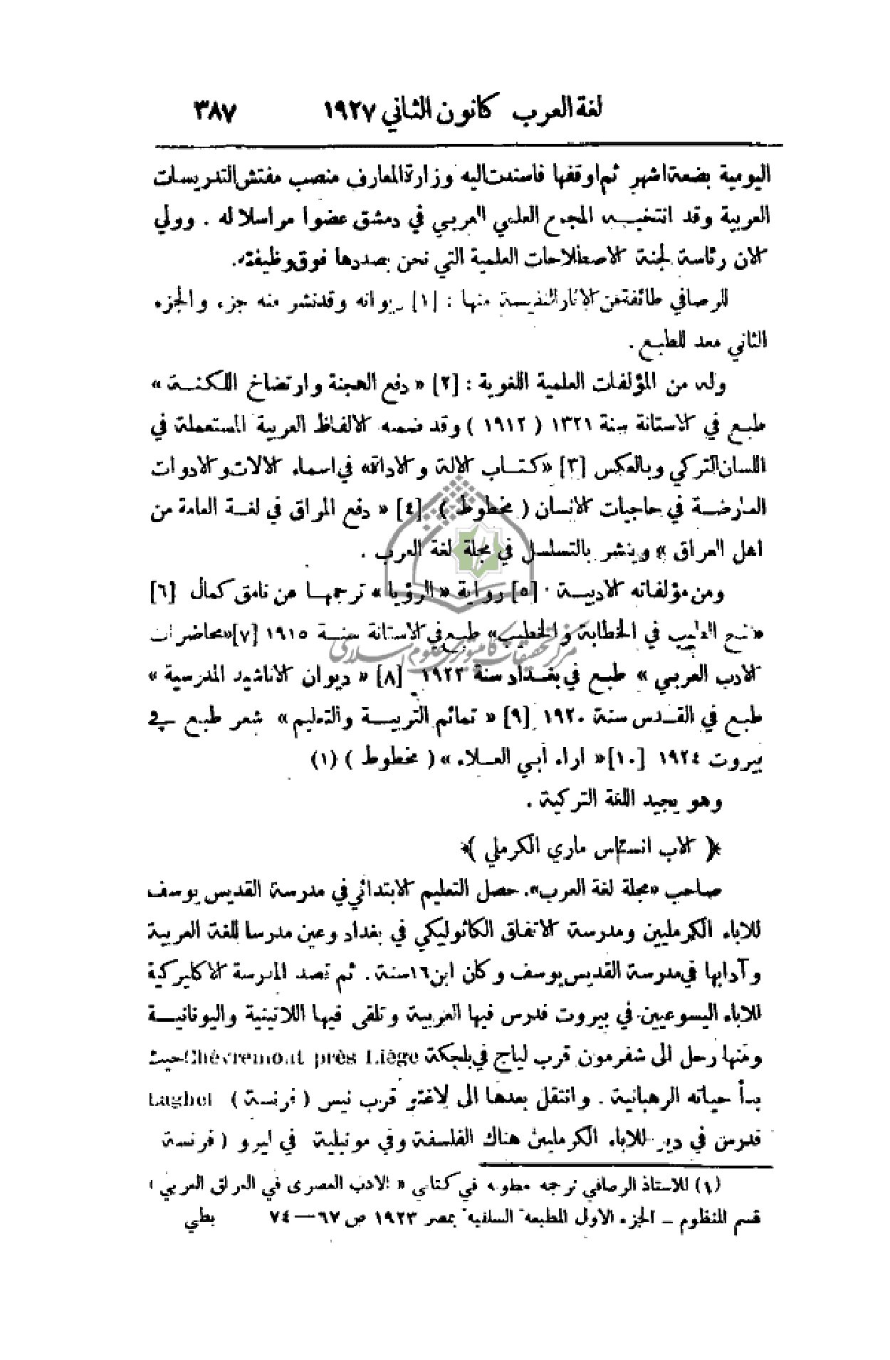 اليومية بضعة أشهر ثم أوقفها فأسندت إليه وزارة المعارف منصب مفتش التدريسات العربية وقد انتخبه المجمع العلمي العربي في دمشق عضوا مراسلا له. وولي الآن رئاسة لجنة الاصطلاحات العلمية التي نحن بصددها فوق وظيفته.