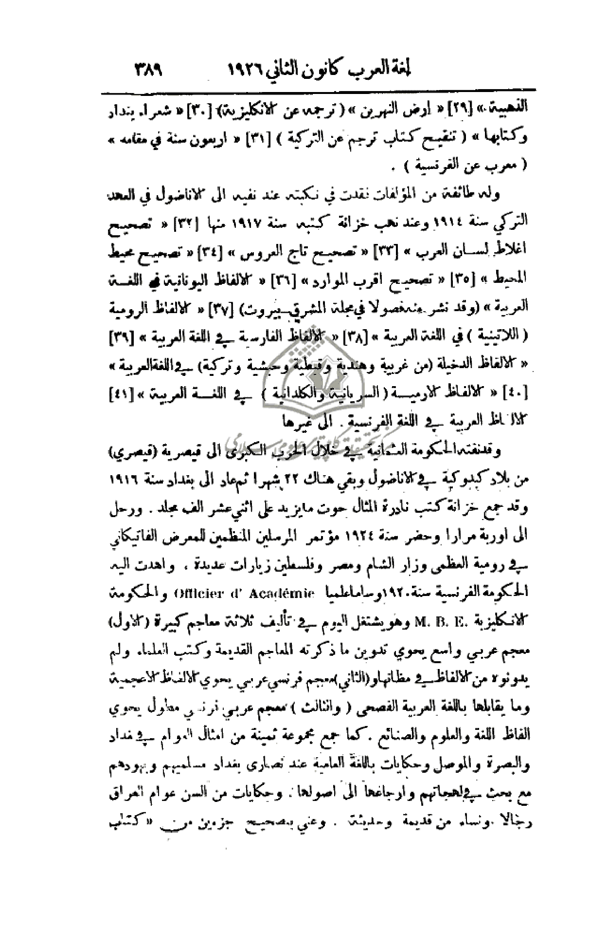 الذهبية) (29) (أرض النهرين) (ترجمة عن الإنكليزية) (30) (شعراء بغداد وكتابها) (تنقيح كتاب ترجم عن التركية) (31) (أربعون سنة في مقامة) (معرب عن الفرنسية).