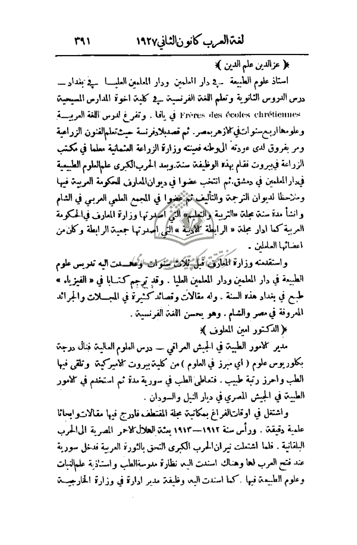 واستقدمته وزارة المعارف قبل ثلاث سنوات وعهدت إليه تدريس علوم الطبيعة في دار المعلمين ودار المعلمين العليا. وقد ترجم كتابا في (الفيزياء) طبع في بغداد هذه السنة. وله مقالات وقصائد كثيرة في المجلات والجرائد المعروفة في مصر والشام. وهو يحسن اللغة الفرنسية.