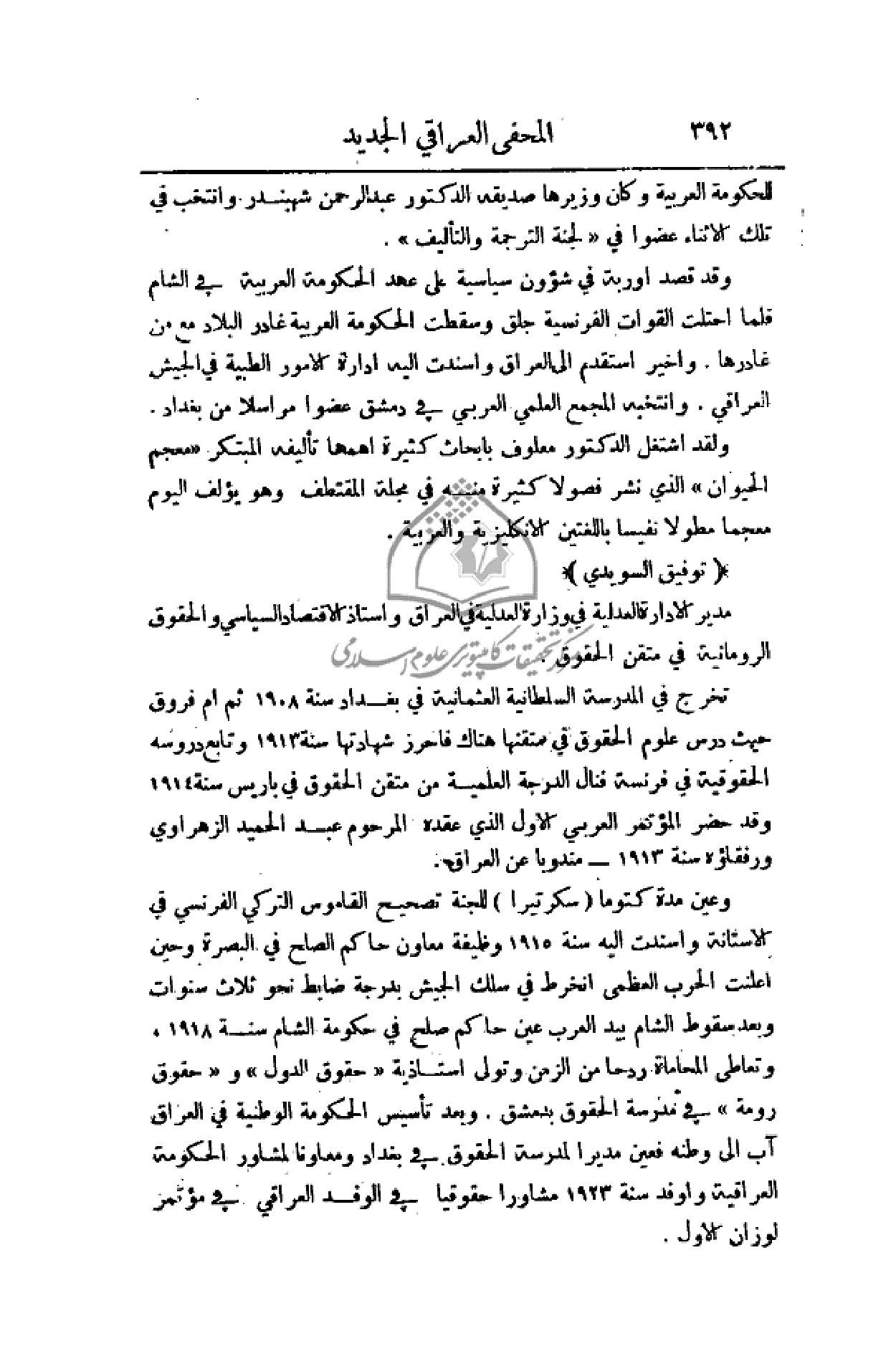 (حقوق الدول) و (حقوق رومة) في مدرسة الحقوق بدمشق. وبعد تأسيس الحكومة الوطنية في العراق آب إلى وطنه فعين مديرا لمدرسة الحقوق في بغداد ومعاونا لمشاور الحكومة العراقية وأوفد سنة 1923 مشاورا حقوقيا في الوفد العراقي في مؤتمر لوزان الأول.