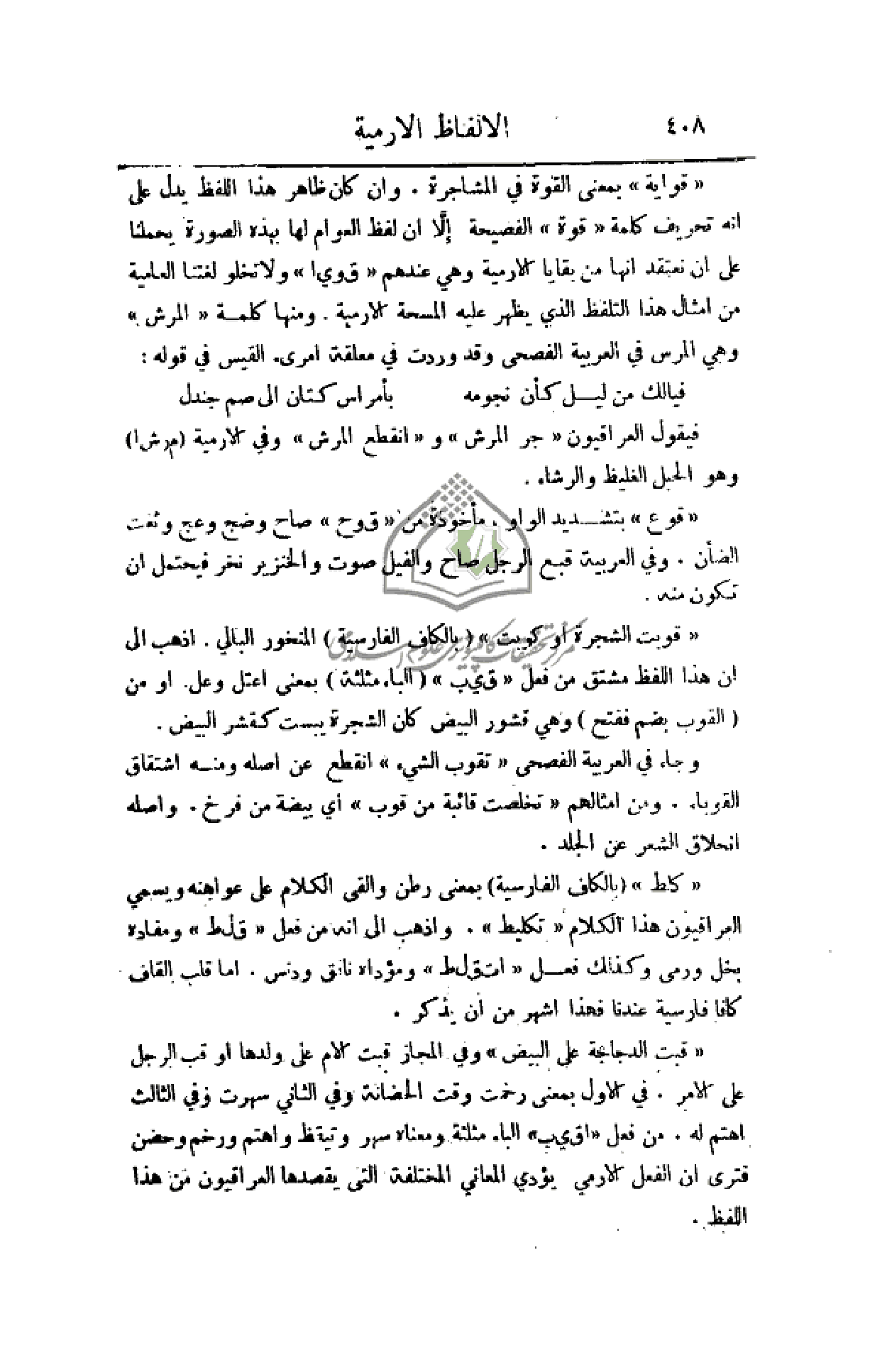 (قواية) بمعنى القوة في المشاجرة. وأن كان ظاهر هذا اللفظ يدل على أنه تحريف كلمة (قوة) الفصيحة إلاَّ أن لفظ العوام لها بهذه الصورة يحملنا على أن نعتقد أنها من بقايا الارمية وهي عندهم (ق وي ا) ولا تخلو لغتنا العامية من أمثال هذا التلفظ الذي يظهر عليه المسحة الارمية. ومنها كلمة (المرش) وهي المرس في العربية الفصحى وقد وردت في معلقة امرئ القيس في قوله: