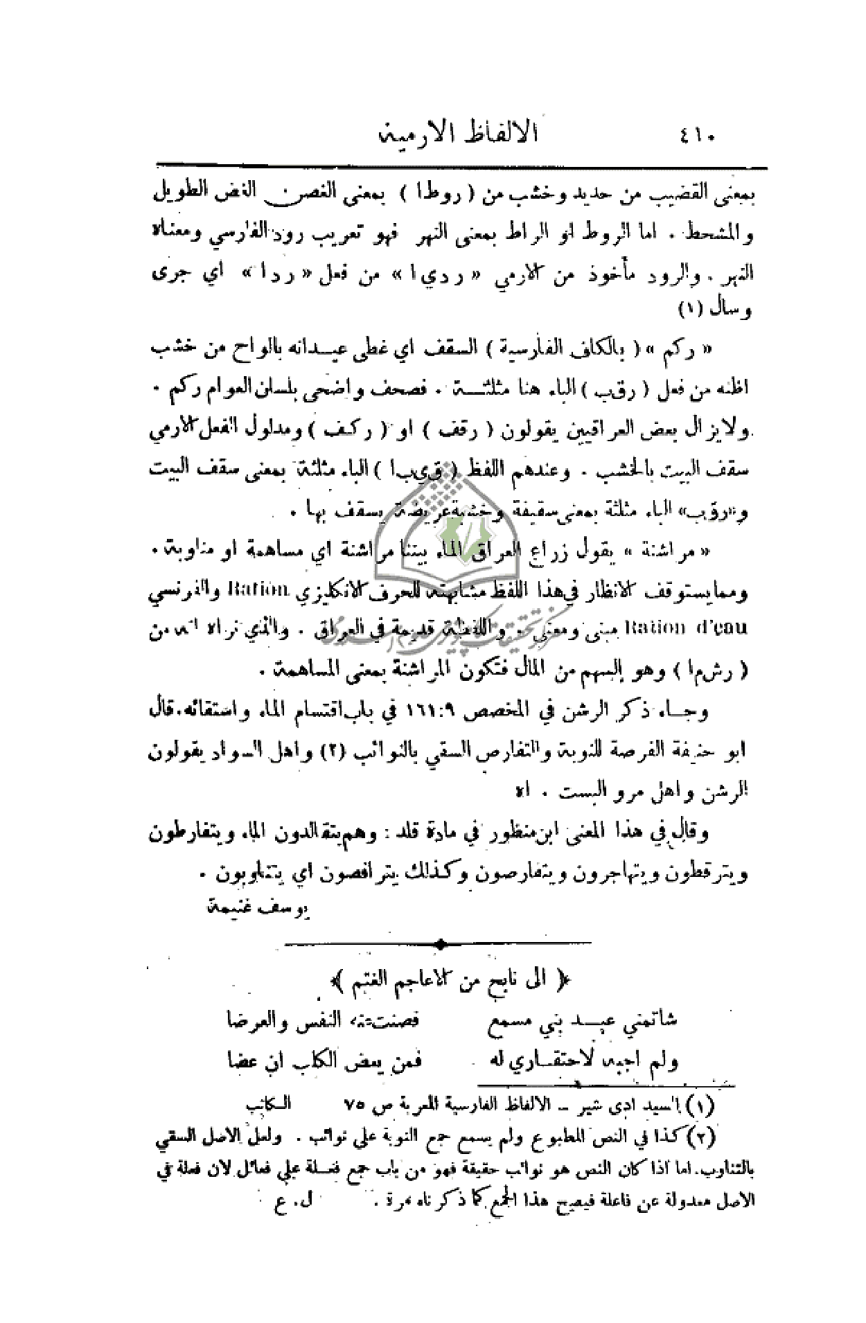 (ركم) (بالكاف الفارسية) السقف أي غطى عيدانه بألواح من خشب أظنه من فعل (ر ق ب) الباء هنا مثلثة. فصحف وأضحى بلسان العوام ركم. ولا يزال بعض العراقيين يقولون (رقف) أو (ركف) ومدلول الفعل الارمي سقف البيت بالخشب. وعندهم اللفظ (ق ي ب ا) الباء مثلثة بمعنى سقف البيت و (ر ق ب) الباء مثلثة بمعنى سقيفة وخشبة عريضة يسقف بها.