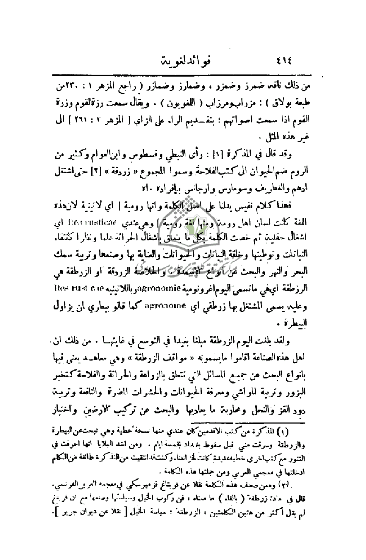 فهذا كلام نفيس يدلنا على أصل الكلمة وأنها رومية (أي لاتينية لأن هذه اللغة كانت لسان أهل رومة ومنها لغة رومية) وهي عندي أي أشغال حقلية ثم خصت الكلمة بكل ما يتعلق بأشغال الحراثة علما ونظرا كانتقاء النباتات وتوطينها وخلقة النباتات والحيوانات والعناية بها وصنعها وتربية سمك البحر والنهر والبحث عن أنواع الأسمدة. والخلاصة الزردقة أو الزرطقة هي الرزطقة أي هي ما تسمى اليوم اغرونومية وباللاتينية وعليه يسمى المشتغل بها زرطقي أي كما قالوا بيطري أن يزاول البيطرة.