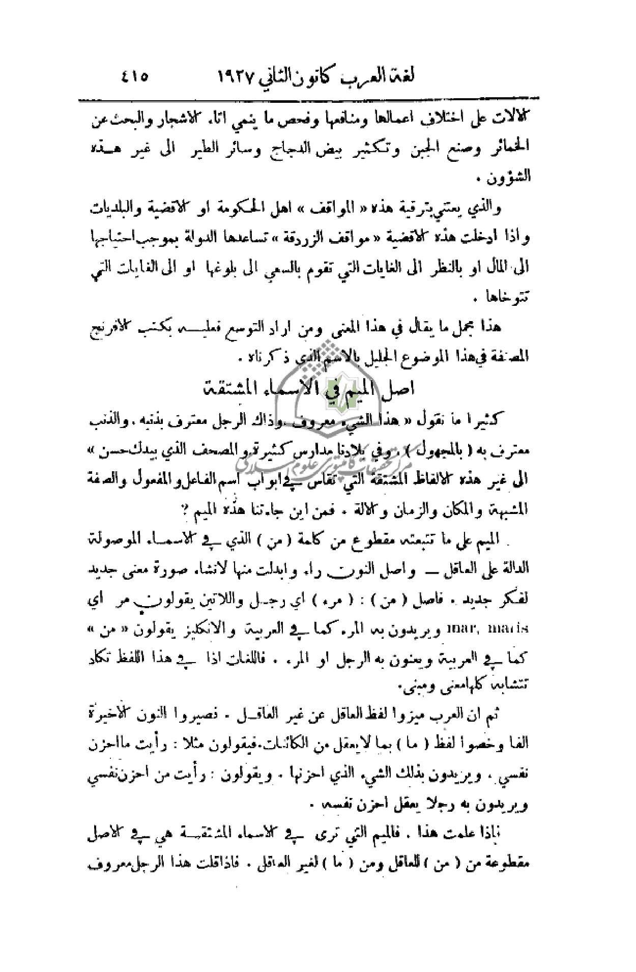 كثيرا ما نقول (هذا الشيء معروف، وذاك الرجل معترف بذنبه، والذنب معترف به (بالمجهول)، وفي بلادنا مدارس كثيرة. والمصحف الذي بيدك حسن) إلى غير هذه الألفاظ المشتقة التي تقاس في أبواب اسم الفاعل والمفعول والصفة المشبهة والمكان والزمان والآلة. فمن أين جاءتنا هذه الميم؟