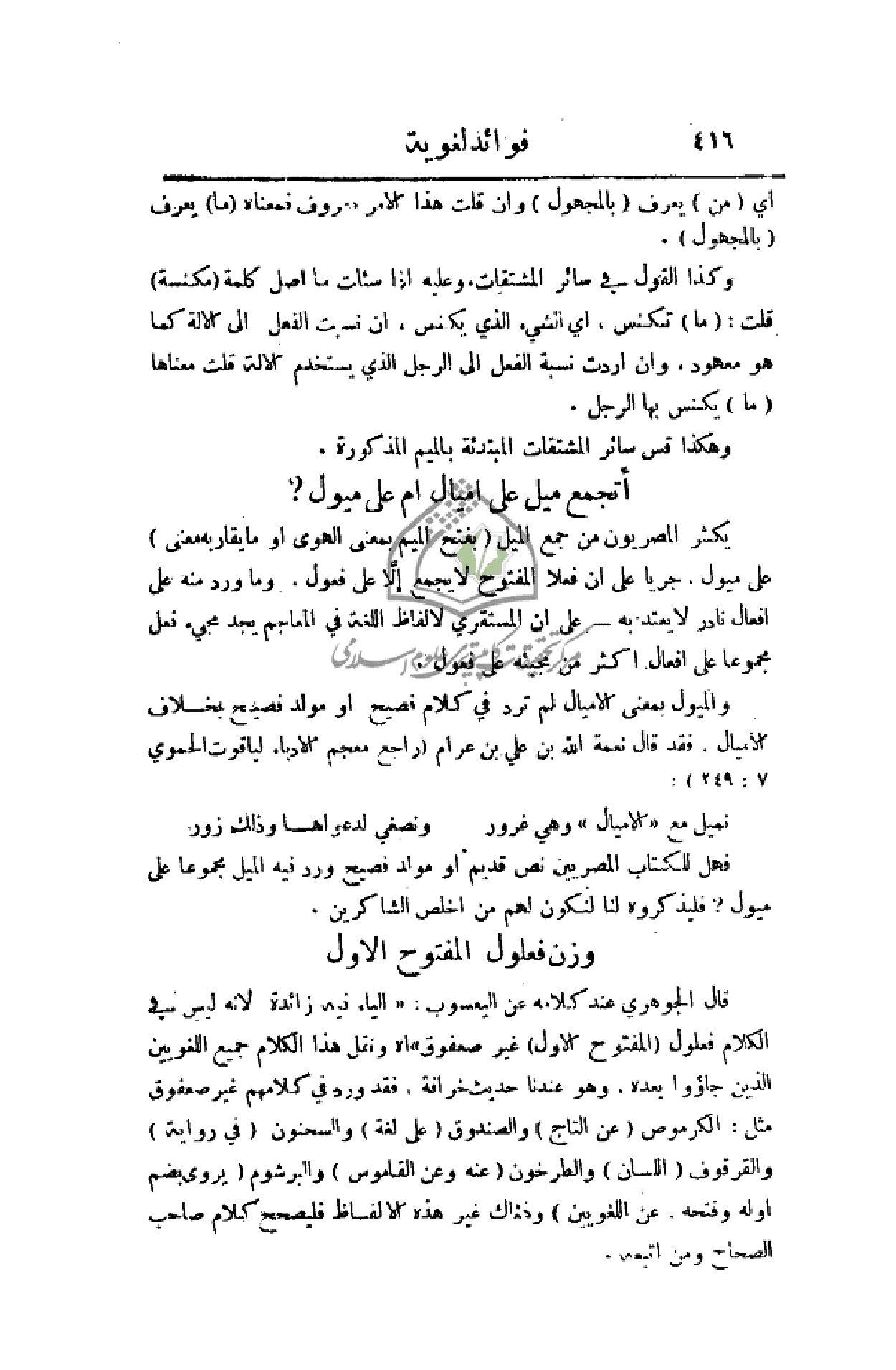 يكثر المصريون من جمع الميل (بفتح الميم بمعنى الهوى أو ما يقاربه معنى) على ميول، جريا على أن فعلا المفتوح لا يجمع إلاَّ على فعول، وما ورد منه على أفعال نادر لا يعتد به - على أن المستقري لألفاظ اللغة في المعاجم يجد مجيء فعل مجموعا على أفعال اكثر من مجيئه على فعول.