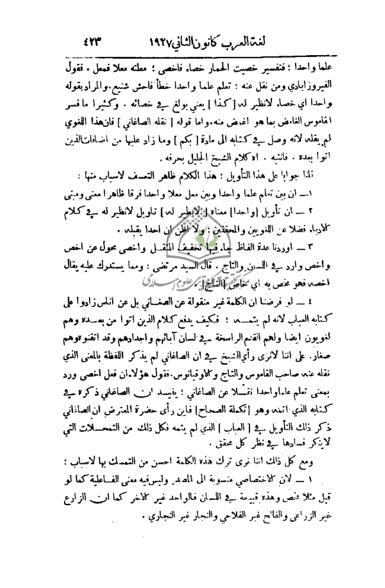 4 - لو فرضنا أن الكلمة غير منقولة عن الصغاني بل عن أناس زادوا على كتابه العباب لأنه لم يتمه؛ فكيف يدفع كلام الذين أتوا من بعده وهم لغويون أيضا ولهم القدم الراسخة في لسان آبائهم وأجدادهم وقد أتقنوه وهم صغار. على أننا لا نرى رأي الشيخ في أن الصاغاني لم يذكر اللفظة بالمعنى الذي نقله عنه صاحب القاموس والتاج والاوقيانوس. فقول هؤلاء أن فعل أخصى ورد بمعنى تعلم علما واحدا نقلا عن الصاغاني؛ يفيد أن الصاغاني ذكره في كتابه الذي أتمه وهو (تكملة الصحاح) فأين رأي حضرة المعترض أن الصاغاني ذكر ذلك التأويل في (العباب) الذي لم يتمه فكل ذلك من التمحلات التي لا ينكر فسادها في نظر كل محقق.